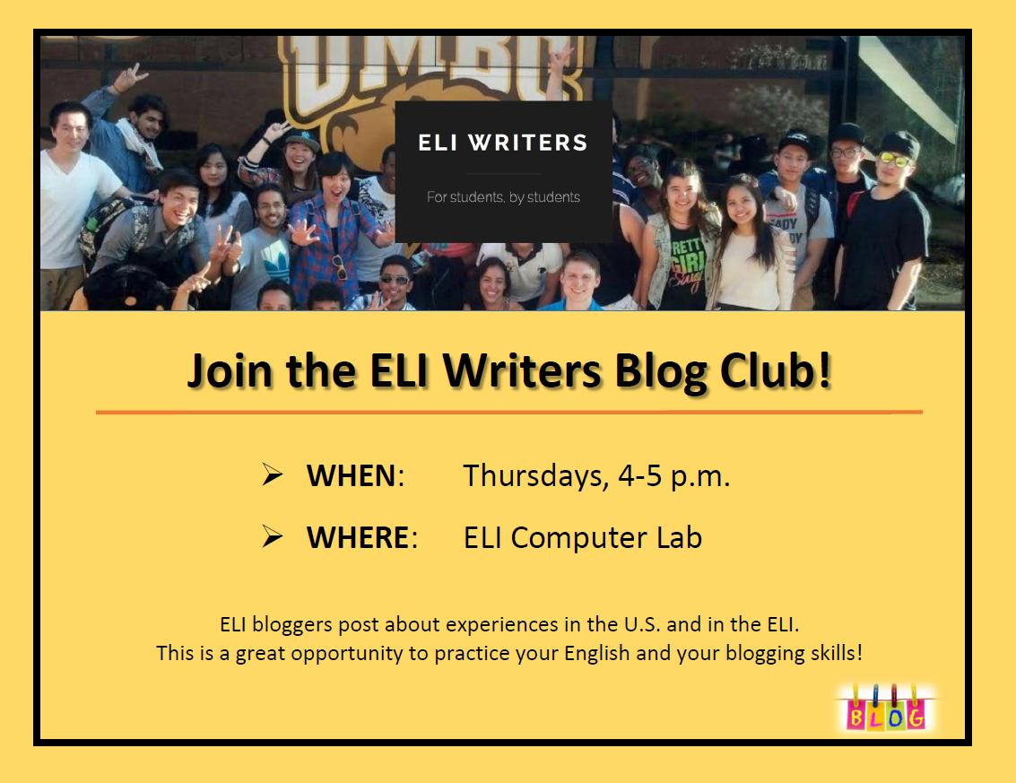 We are back! Thanks to our ELI bloggers, the ELI Writers Blog Club went very well last Fall semester. Let's to this again!
