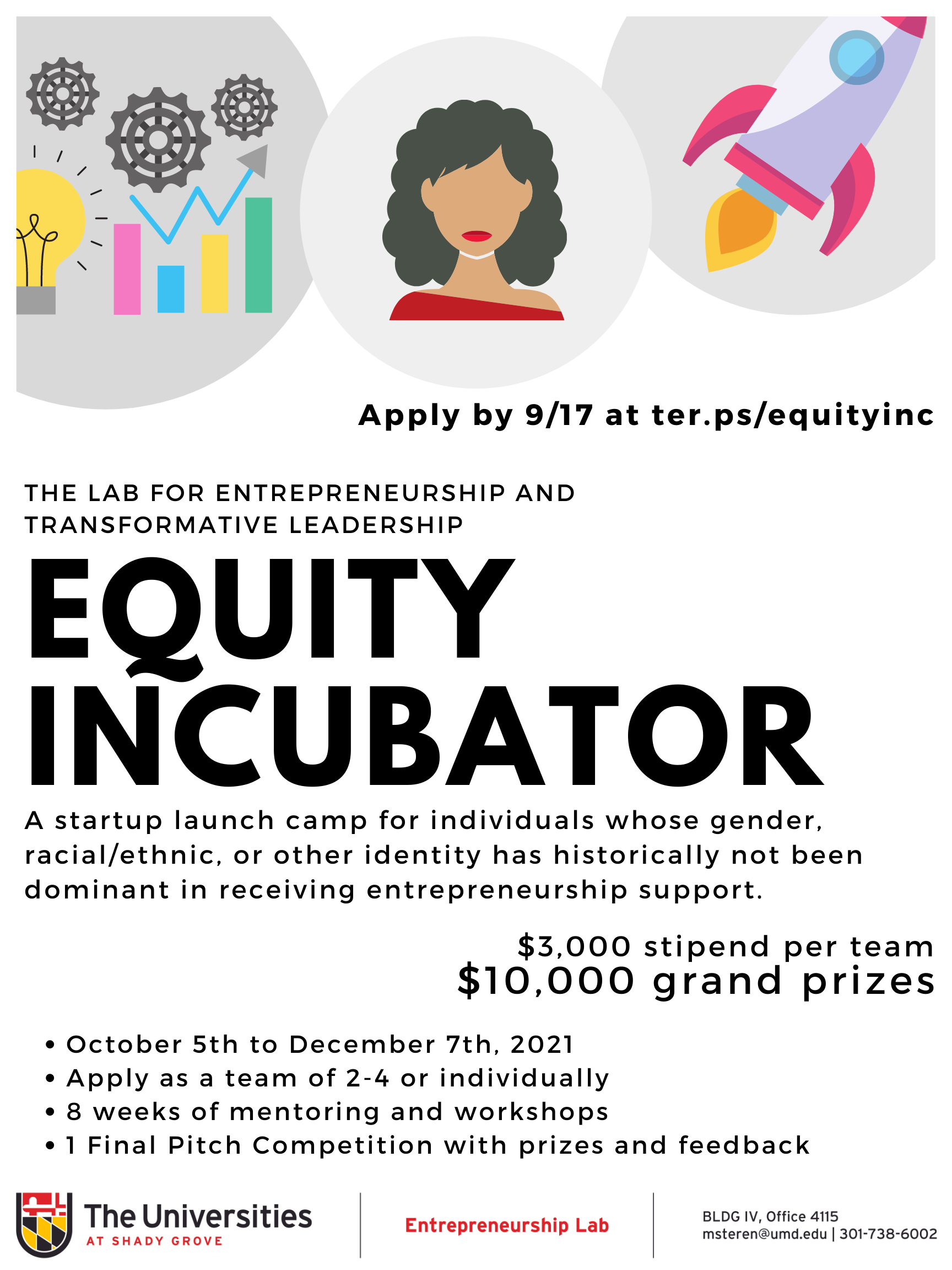 2. University at Shady Grove’s Equity Incubator- Startup launch camp for USG students and community members in Montgomery County. Comes with $3k, with more available via a pitch competition (due September 17). Sign up here: