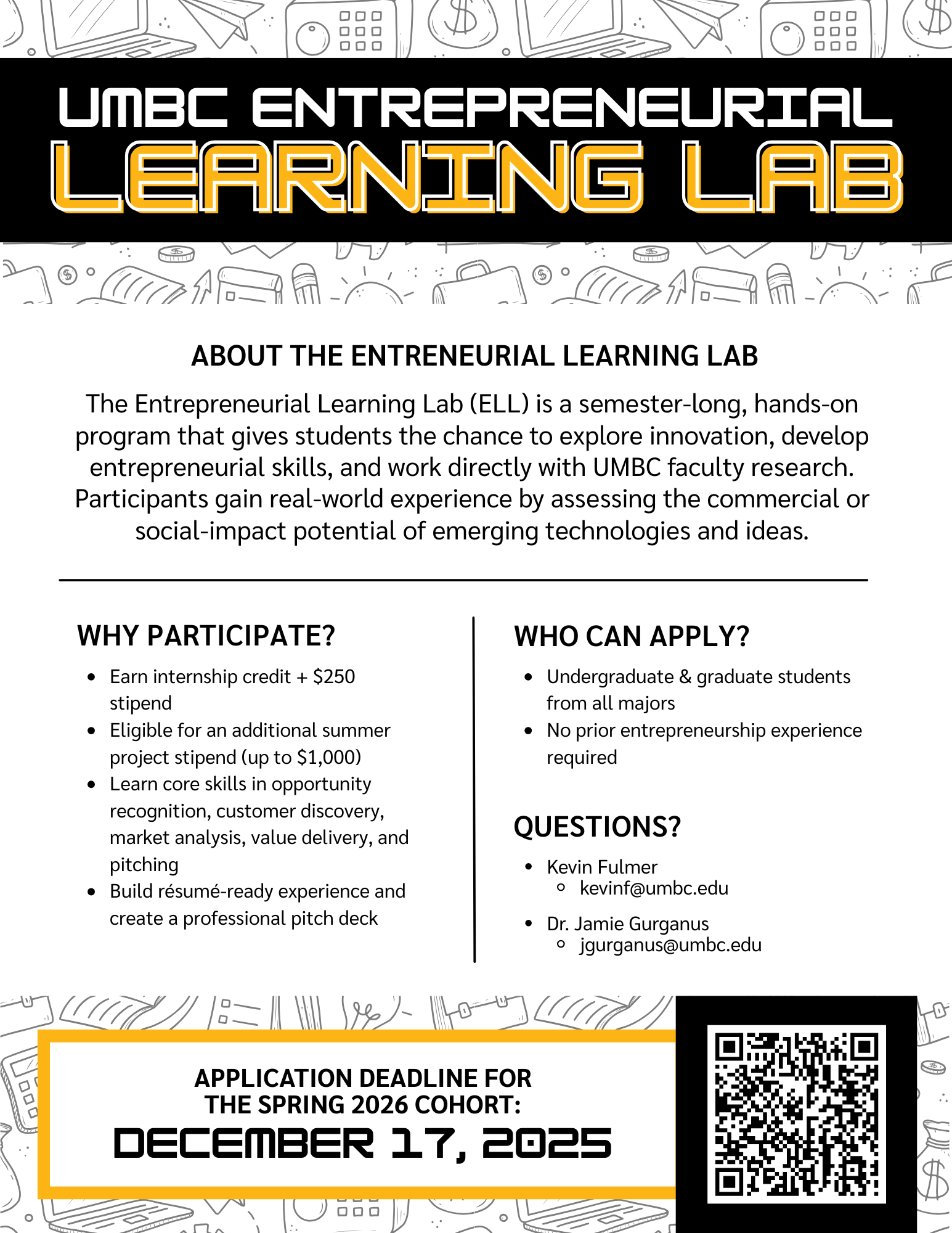 We're excited to invite applications for the Spring 2026 Cohort of the Entrepreneurial Learning Lab (ELL)—a hands-on program where students build entrepreneurial skills, earn internship credit, and work with UMBC faculty to assess the commercial or social-impact potential of their research.