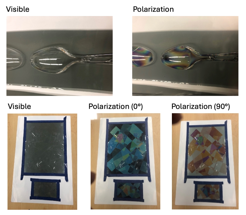 Photo: The spoon observed in visible (top left) and between polarizing filters (top right), and the tape mosaic observed in visible (bottom left) and polarized light (bottom center/right). Rotating the observing polarizer (in front of the camera) to different angles creates a different color pattern. Photo Credit: Brent McBride/ESI.