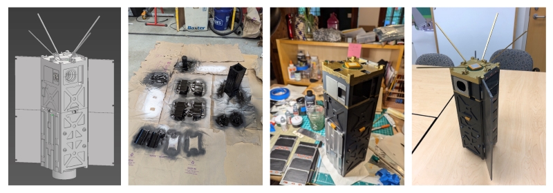 Photos: Process composite of the development of the HARP CubeSat 3D model. The monobloc model derived from the original satellite CAD file (left), components were primed (center left), painted to match the satellite (center right), and the final model (right). Photo Credit: L. Sobieski/ESI.
