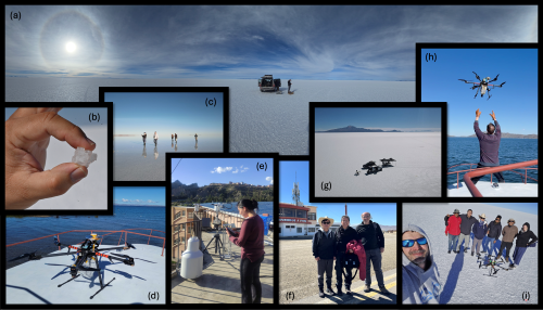 From May 10-22, 2025, UMBC Earth and Space Institute (ESI) faculty Dr. Vanderlei Martins, Dr. Lorraine Remer, Dr. Xiaoguang Xu, Dominik Cieslak, and Ian Decker led a special field campaign, based in Bolivia, to study the way sunlight reflects off mirror-like or homogenous natural surfaces. Lake Titicaca and salt pan Salar de Uyuni, two of the highest natural calibration sites in the world, are used by the Earth science community to update the calibration and monitor the performance of many remote sensing climate instruments on-orbit. The Hyper-Angular Rainbow Polarimeter (HARP2), a multi-angle polarimeter instrument built at ESI, makes near-daily measurements of the region from NASA’s currently orbiting Plankton Aerosol Cloud ocean Ecosystem (PACE) satellite. The goal of this particular field campaign was to measure the lake and salt pan during PACE overpasses to validate HARP2 measurements. Extra measurements at different times and different geometries will help further characterize these sites for PACE and other current and future Earth observation missions.