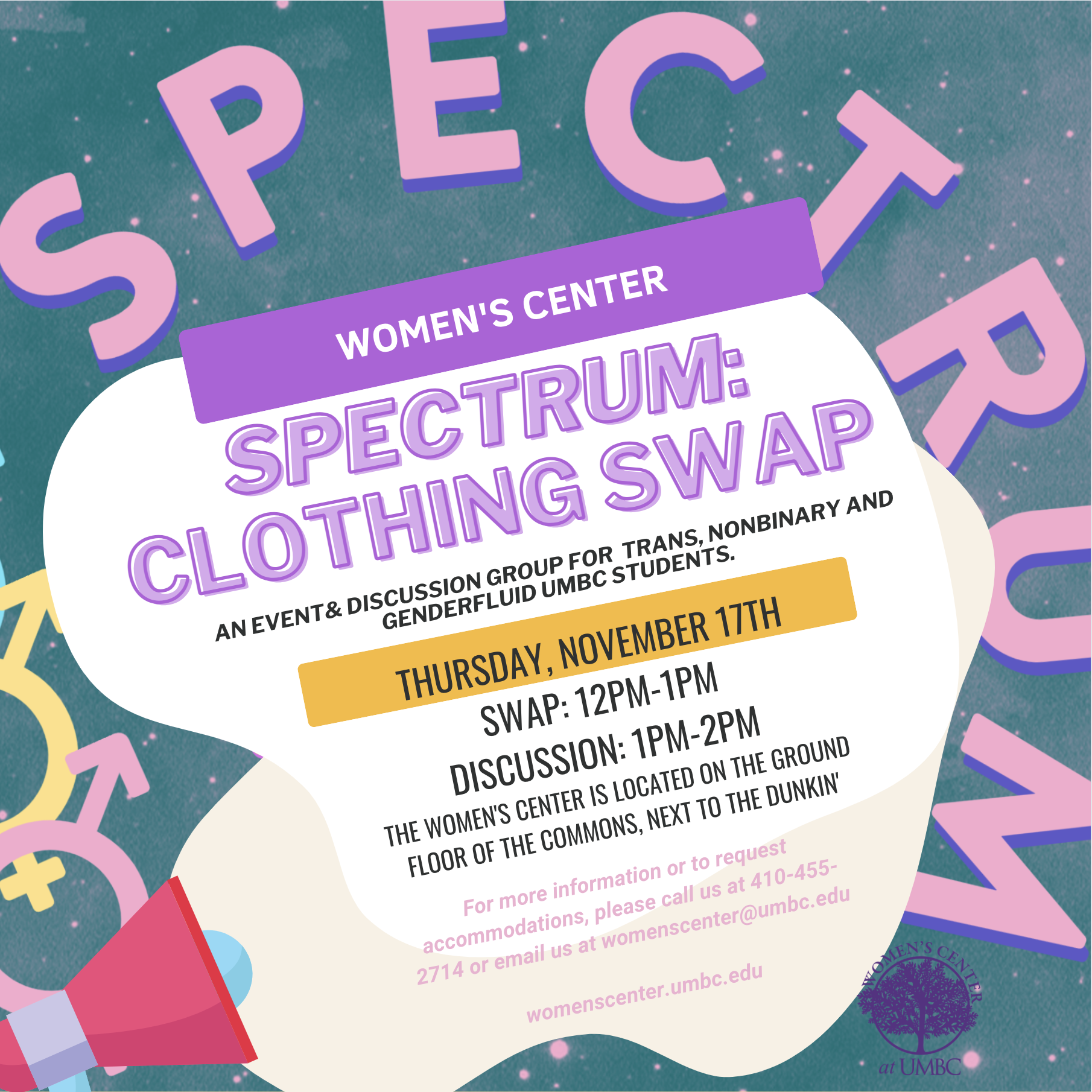 The Women's Center is having a Spectrum Clothing Swap this Thursday, November 17th! They are looking for all types and sizes of clothes, jewelry, and unused accessories (hair clips, tights, socks, etc). Donations will be accepted at the Women's Center during normal operating hours through November 17th at 12pm. Please wash clothing before donating, and only bring clothes in good condition.