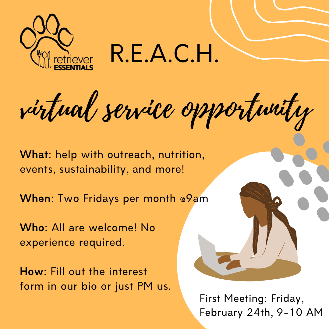 Retriever Essentials Action Committee Hub (REACH) is currently seeking volunteers for virtual service twice per month! REACH is a group of students, staff, and faculty from all departments and levels of experience that meets to help Retriever Essentials achieve our goals!