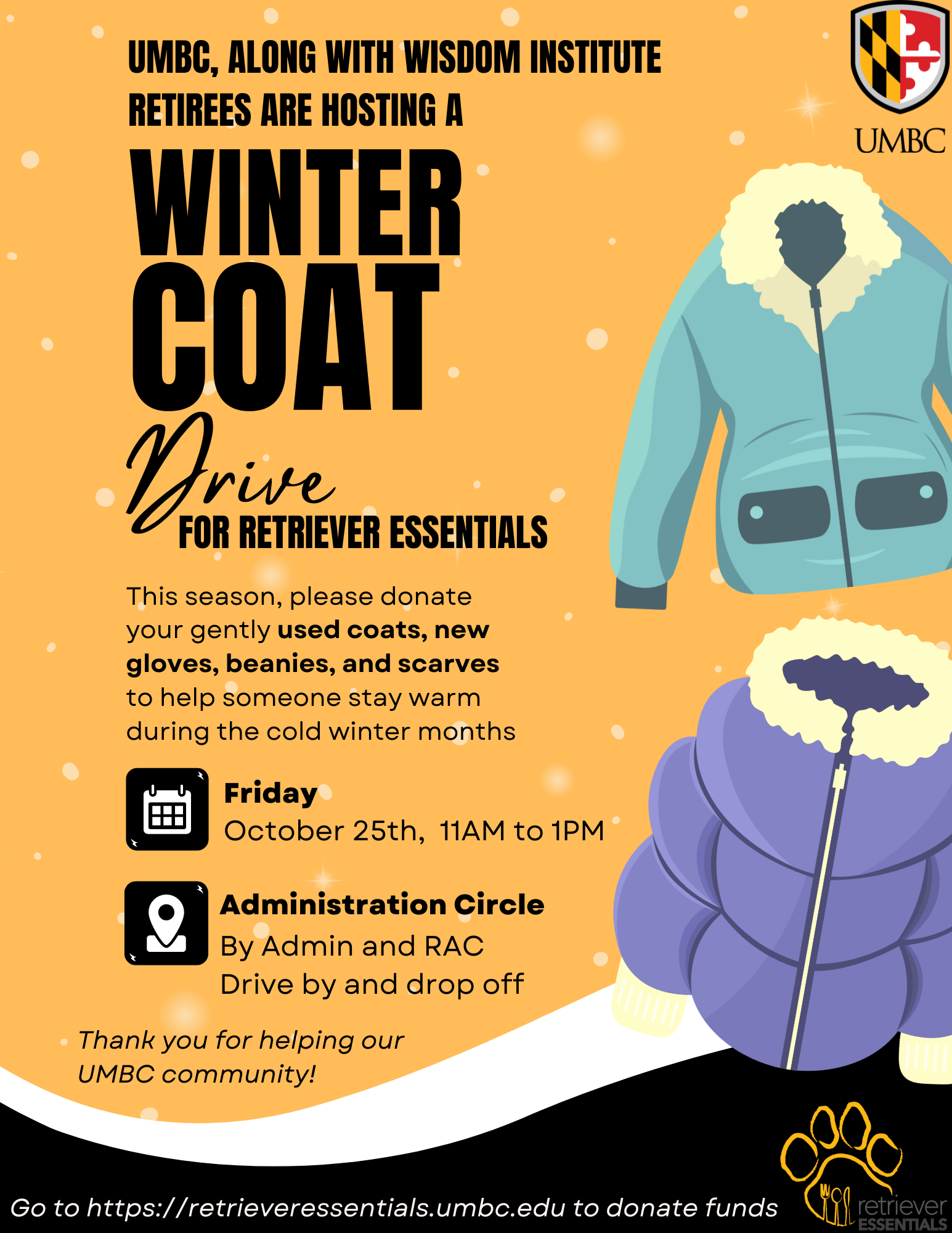 As it is getting cold outside, please come next Friday, Oct 25th to drop-off winter clothes to donate to UMBC community members and students who need them. We especially need gloves, men's coats, and hats - but please bring it all, scarves, women and childrens' clothes too!