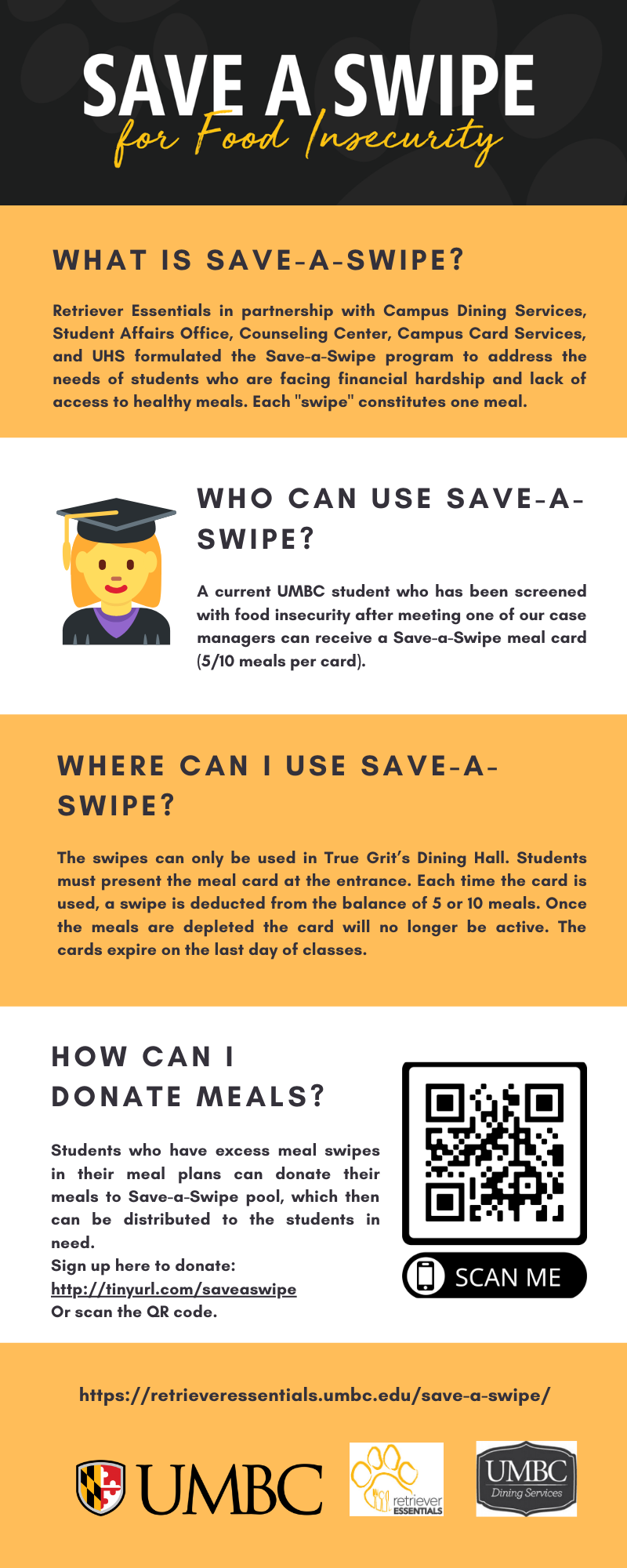 Save-a-Swipe is a partnership between Retriever Essentials, Chartwells, and Campus Card Services which allows you to donate 5 or 10 swipes from your meal plan that can be used by students who are experiencing food insecurity. Please share your extra meal swipes with your peers in need before the swipes expire.