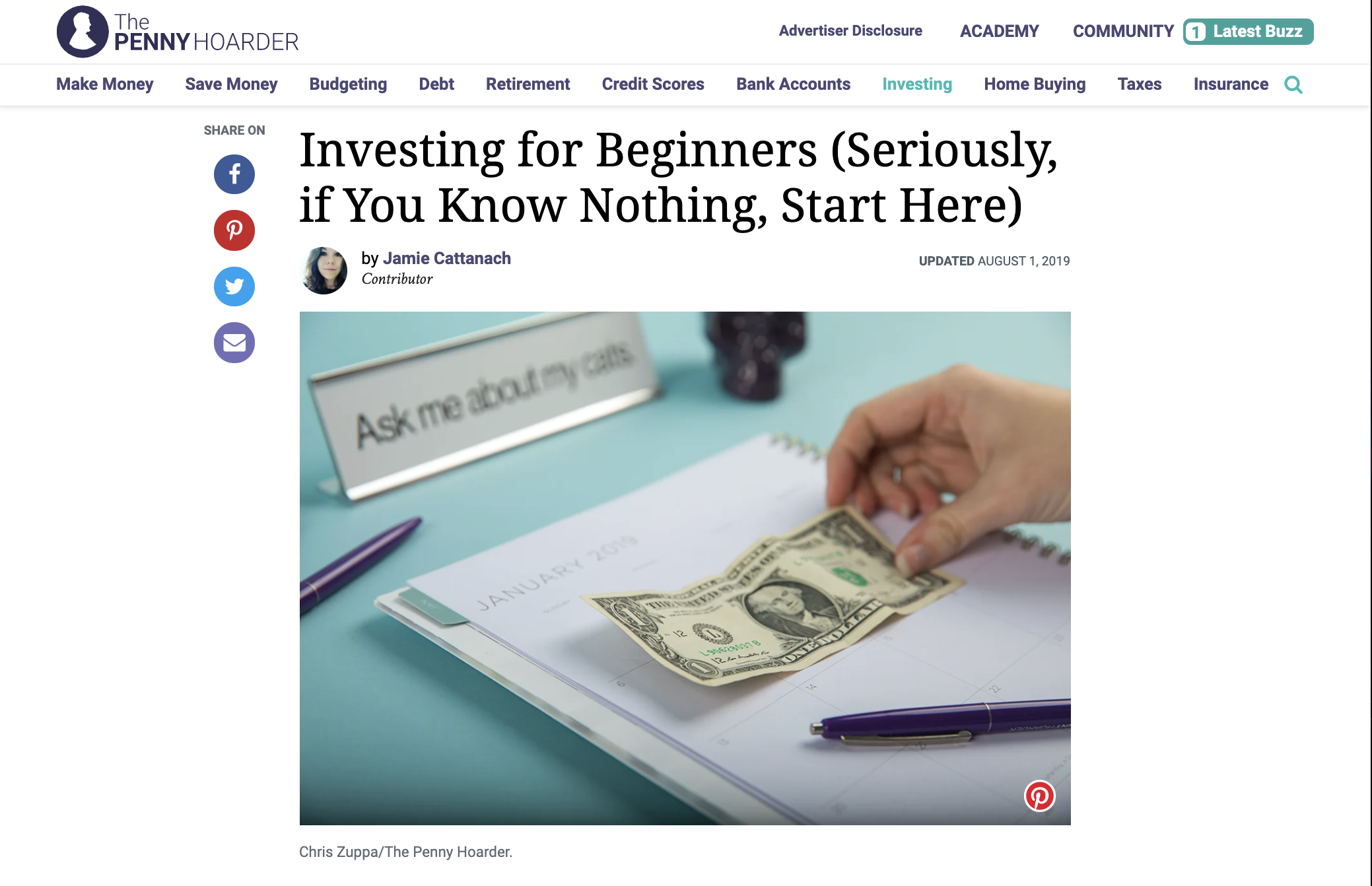 [Alt: Screenshot of The Penny Hoarder article featuring a cover image of a dollar bill placed over an agenda book on a desk]