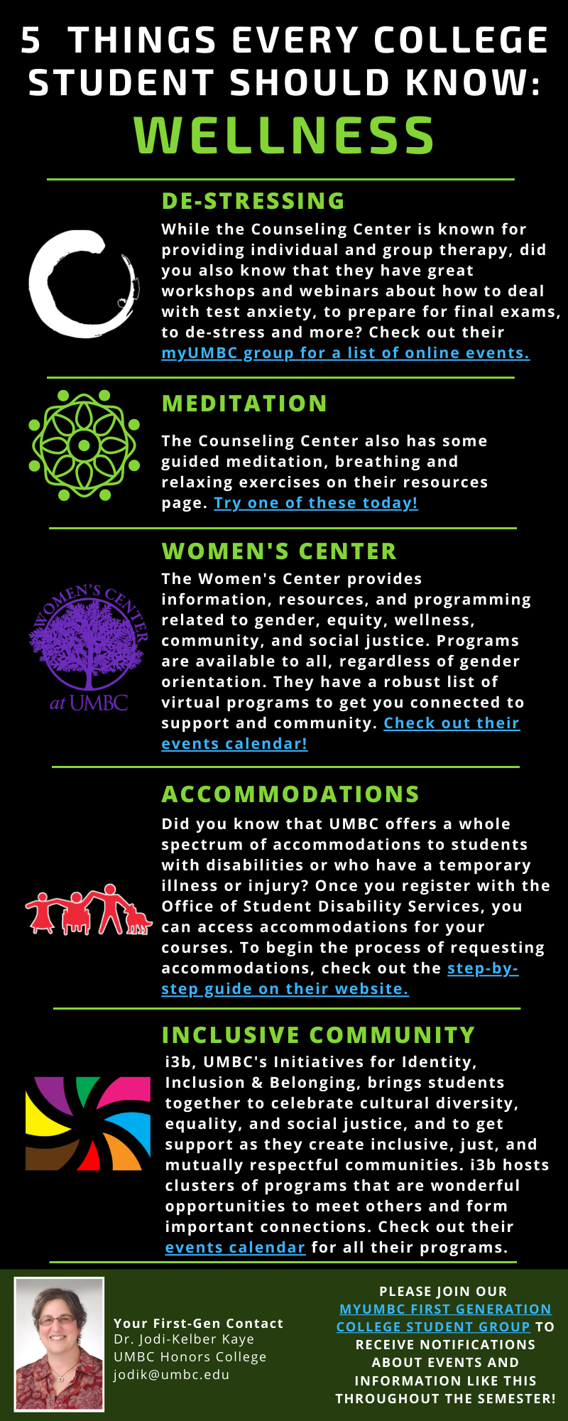 De-Stressing: While the Counseling Center is known for providing therapy, did you also know that they have great workshops and webinars about how to deal with test anxiety, to prepare for final exams, to de-stress and more? Check out their myUMBC group for a list of online events.