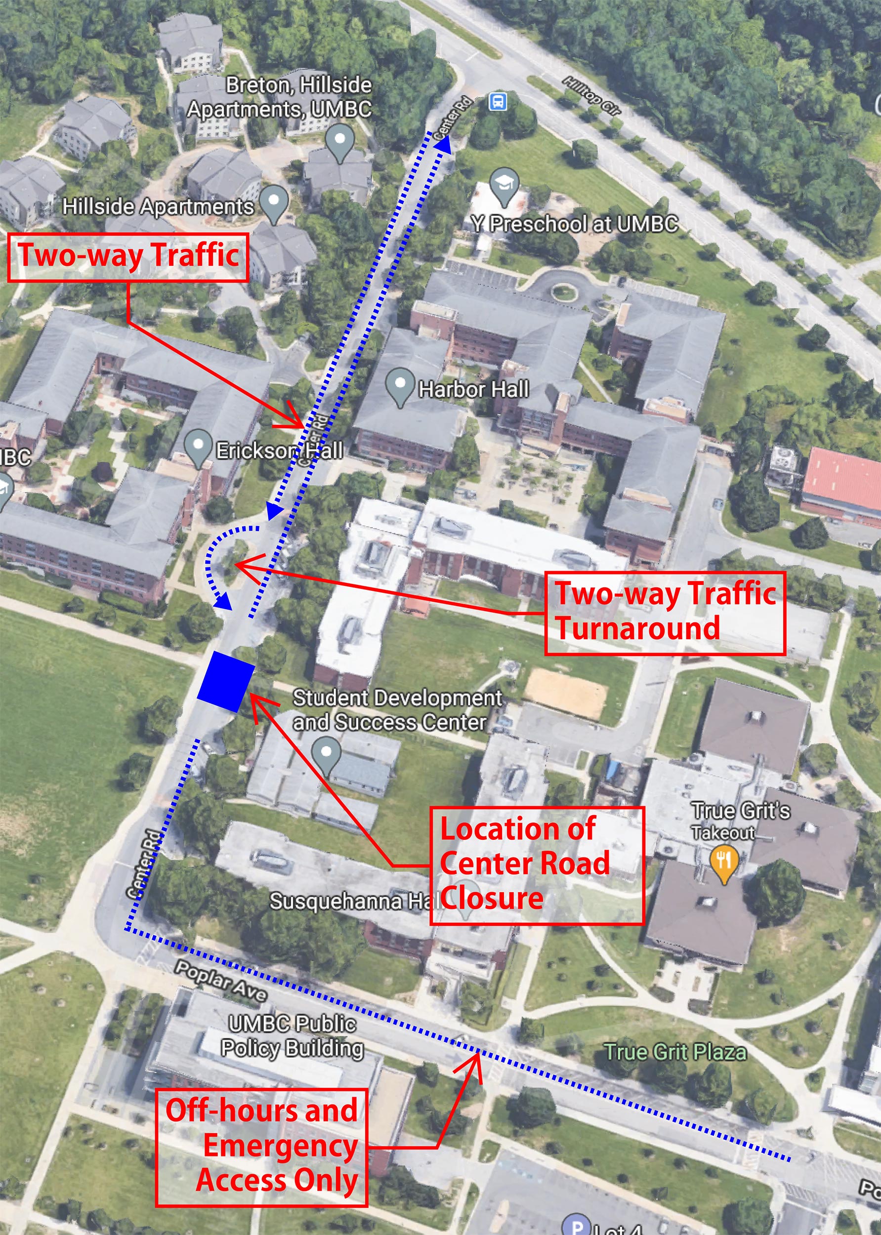 UPDATE 3/21/2021: Work required to reopen Center Road will not be complete until mid-afternoon Monday 3/22/2021. Center Road will remain two way until that time. We appreciate your understanding as we implement these improvements to the UMBC campus.