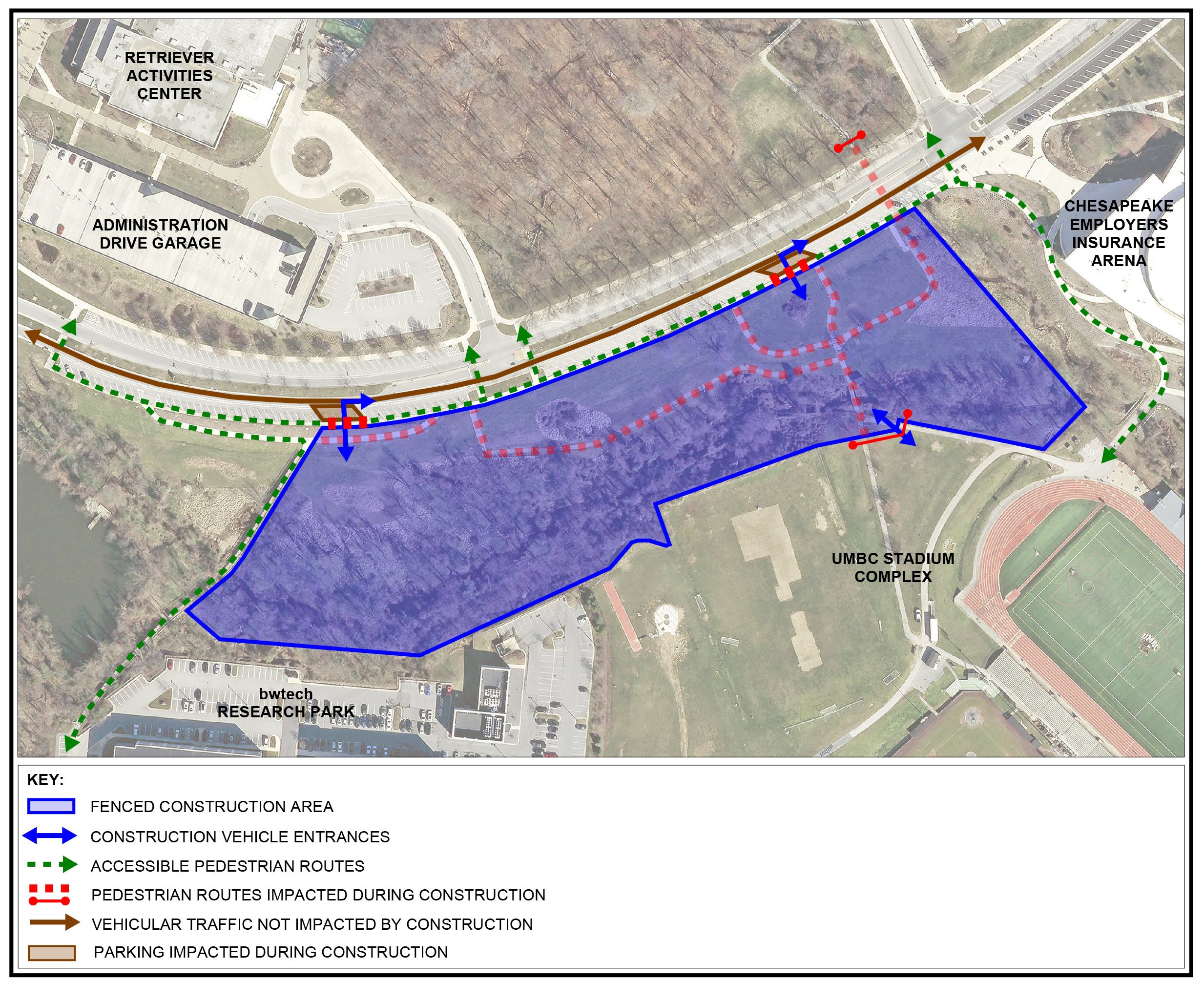 Construction vehicle entrances from Hilltop Circle will require closure of a handful of parking spaces along the outer loop of Hilltop Circle. Portions of sidewalk at the construction vehicle entrances will also need to be closed for the duration of construction. Signage will direct pedestrians around these closures, via accessible routes. Any changes or additional information will be communicated through the myUMBC Facility Management Group and other appropriate methods.