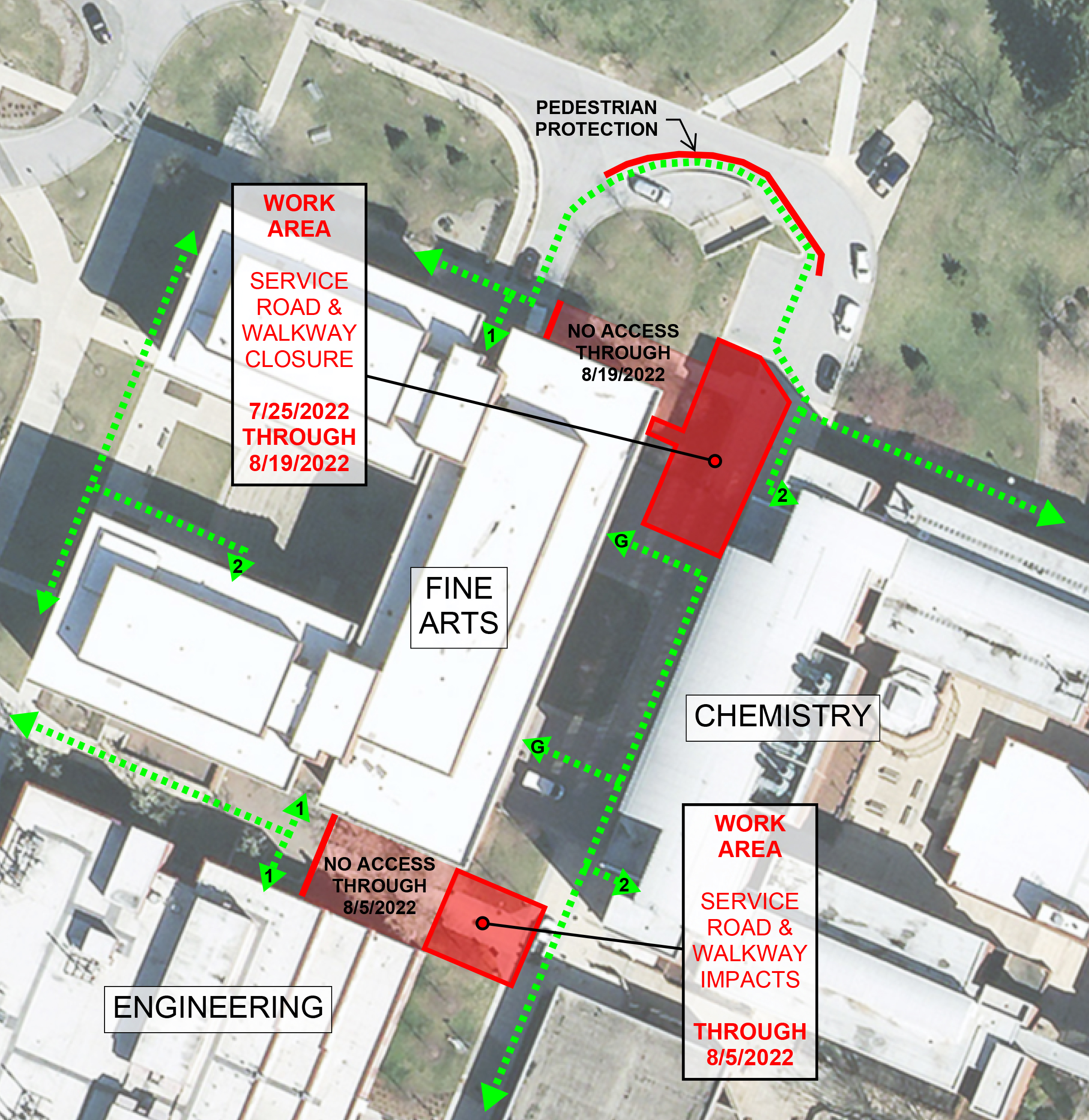 UMBC is currently undertaking multiple utility improvements on campus. Upgrades to the campus domestic water service will impact pedestrian routes and service access between Fine Arts and Chemistry. The impacts will occur between July 25th, 2022 and August 19th, 2022. Accessible routes through the area will be maintained for the duration of the work. All adjacent building entrances will remain open, and deliveries can continue with slight modifications. Signage will be posted to guide the campus community around the area. No outages to buildings are anticipated. Please see attached graphic further describing the impacts.