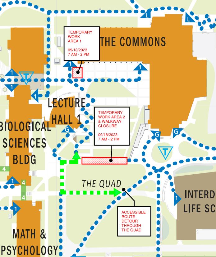 On Monday, 9/18/2023 between 7 AM and 2 PM, a section of sidewalk between The Quad and The Commons terrace will be temporarily closed to complete site survey work related to the upcoming renovation of Lecture Hall 1. Signage will redirect pedestrians to an accessible route through The Quad. Please refer to the attached graphic for additional information.