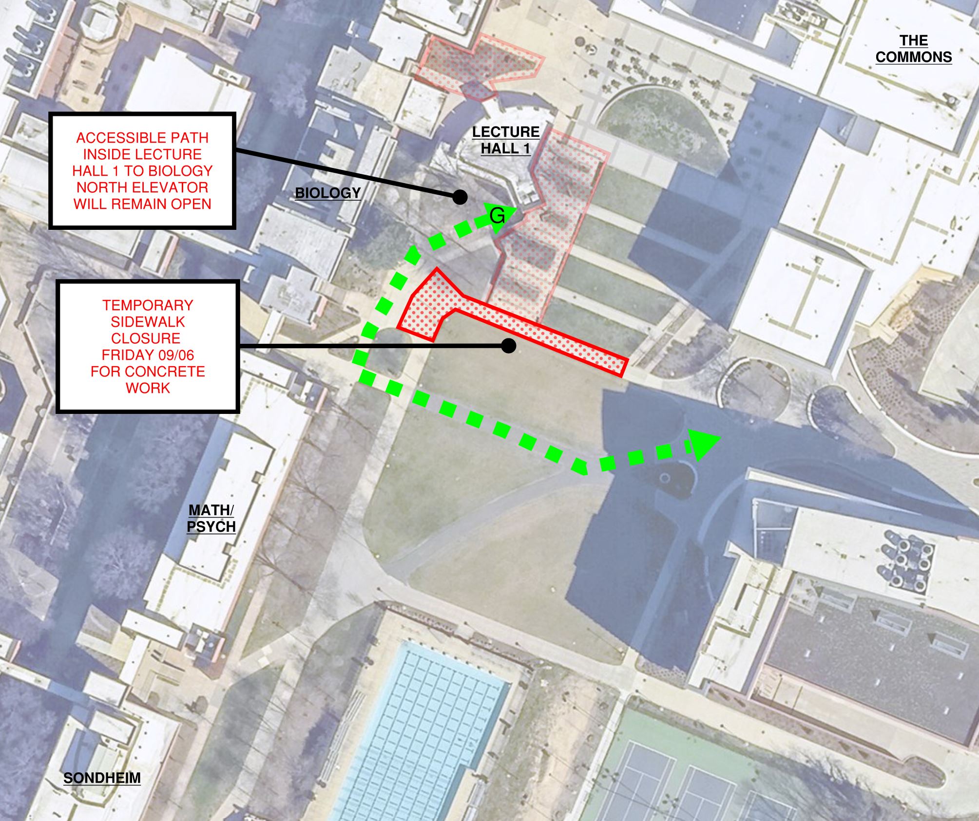 On Friday, 09/06/2024 between 7 AM and 4 PM, a section of sidewalk at the north end of the Quad will be temporarily closed to complete concrete work for the Lecture Hall 1 renovation. Signage will redirect pedestrians to an accessible route through The Quad. The accessible route from Lecture Hall 1 to the lower level of Biology will also remain open during this work. Please refer to the attached graphic for additional information.