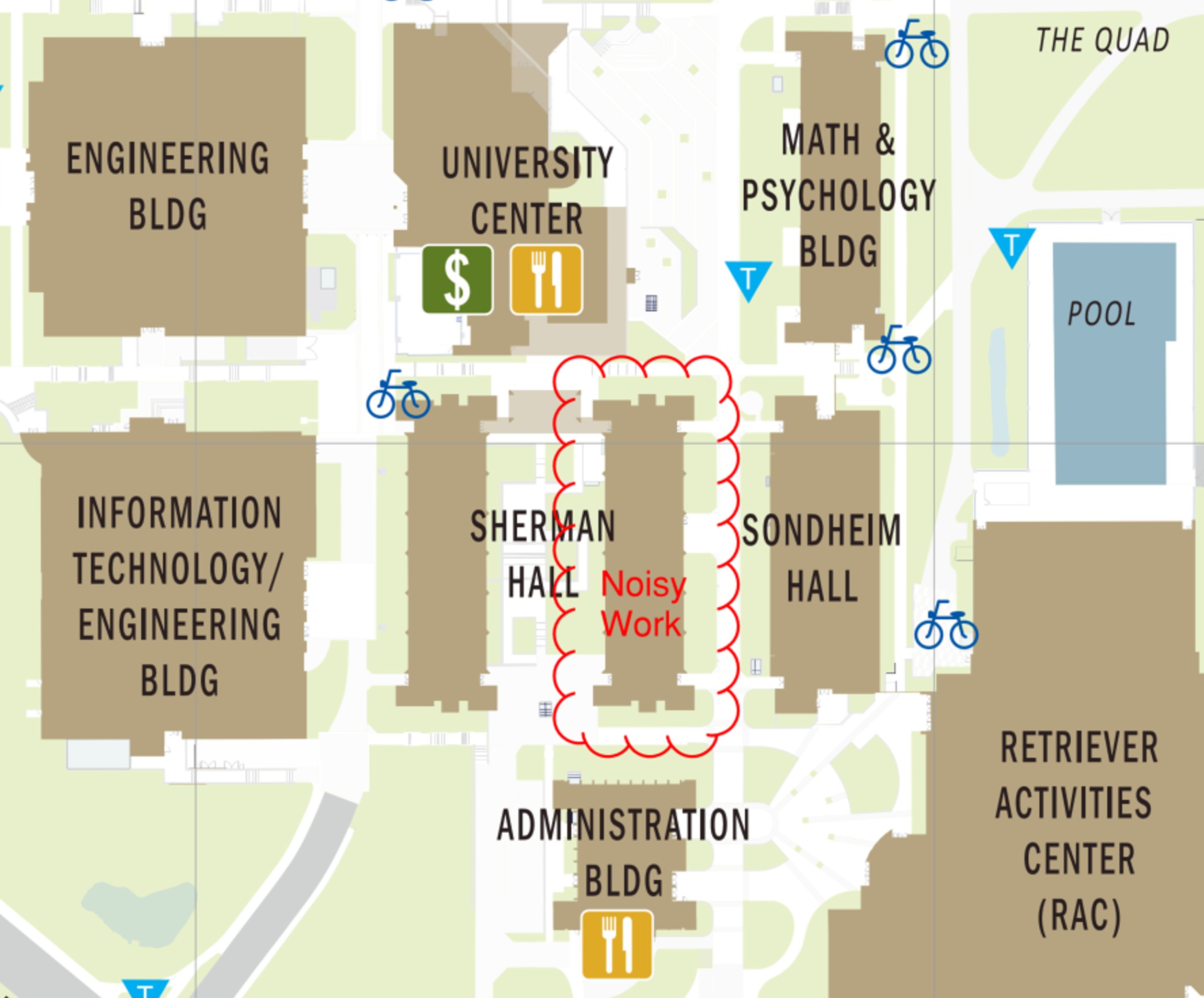 From 11/11 – 12/5: Exterior work will continue on the Sherman Hall Renewal Project. The North and South towers will be prepared for new steel, new window openings and new brick while the long east and west elevations will have their exterior facades removed. This work will generate some periods of intermittent and some periods of consistent noise levels above normal conditions. This may disrupt activities that require very quiet conditions.