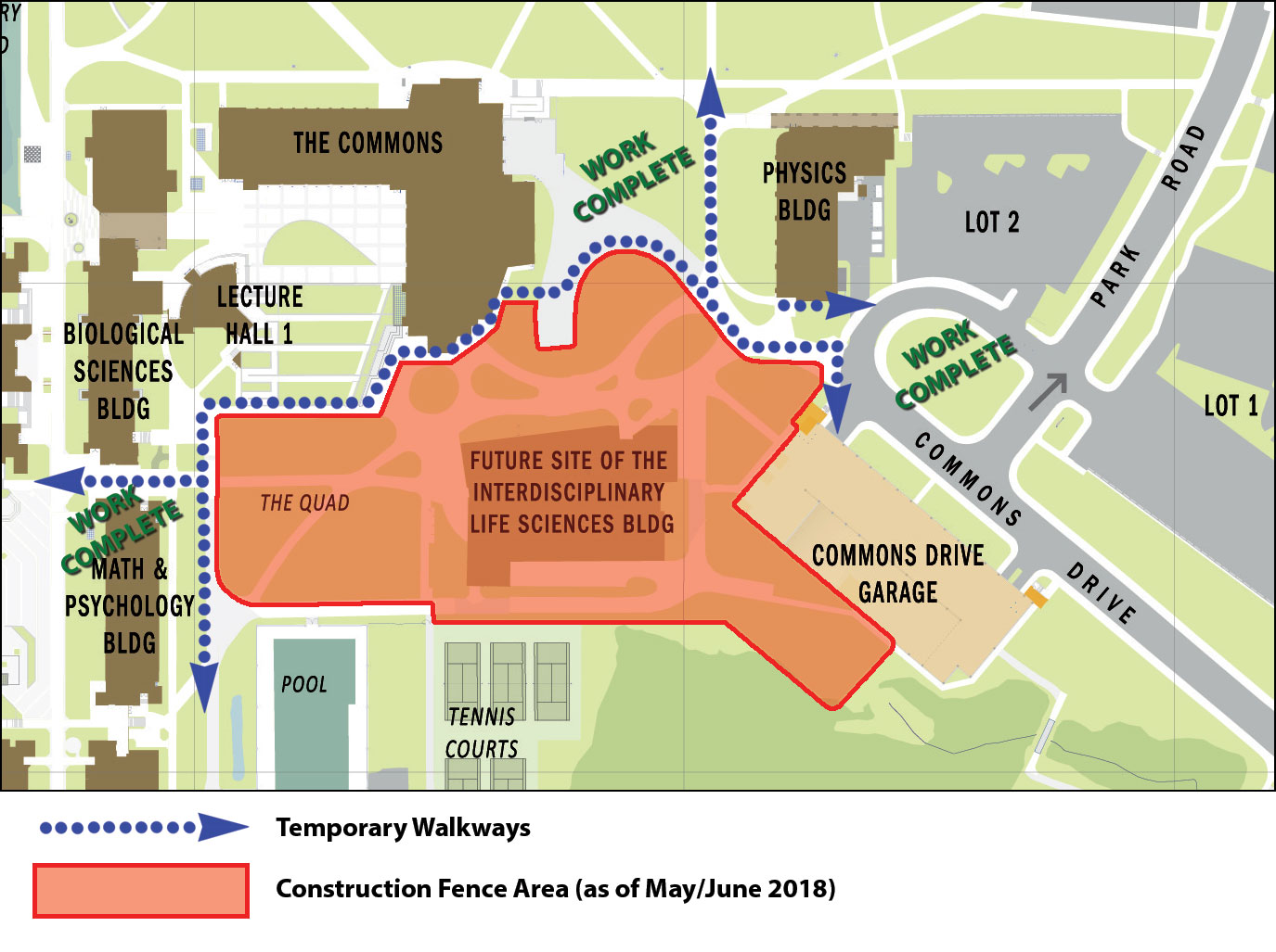 Early in the summer of 2018, a number or changes will be made to the ILSB construction fence line, which will improve vehicular and pedestrian circulation in the immediate area. Work will be completed in the area between the Commons and Physics building as well as between the Biology ans Math/Psych buildings. These areas, which include new sidewalks and landscaping, will be permanently opened to pedestrians in early June. Minor adjustments will be made to the walkway between the Commons building and the Commons garage to allow for the construction fence line to be expanded slightly. The temporary walkway on the east side of the Physics building, which is no longer necessary, will be removed and the area landscaped.