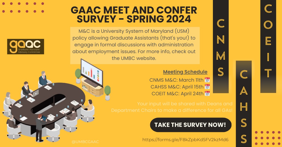Meet and Confer (M&C) is a policy within the University System of Maryland (USM) that allows Graduate Assistants to participate in formal discussions with the administration regarding employment-related matters, including compensation and benefits. To learn more about M&C, please visit the UMBC website.