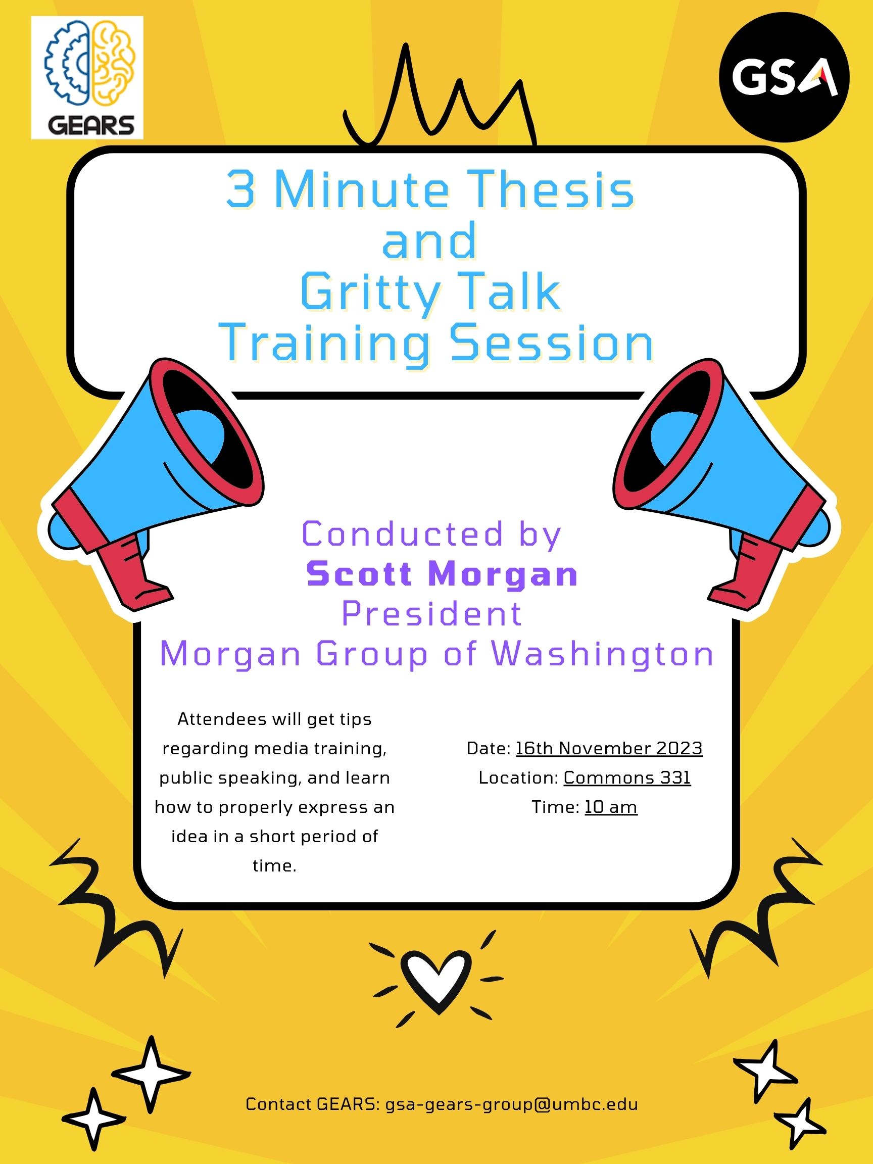 GEARS in collaboration with Scott Morgan, President of The Morgan Group of Washington is hosting a leadership workshop titled "3 Minute Thesis / The Gritty Talks Training Session" on November 16th, at 10 am, Commons 331.