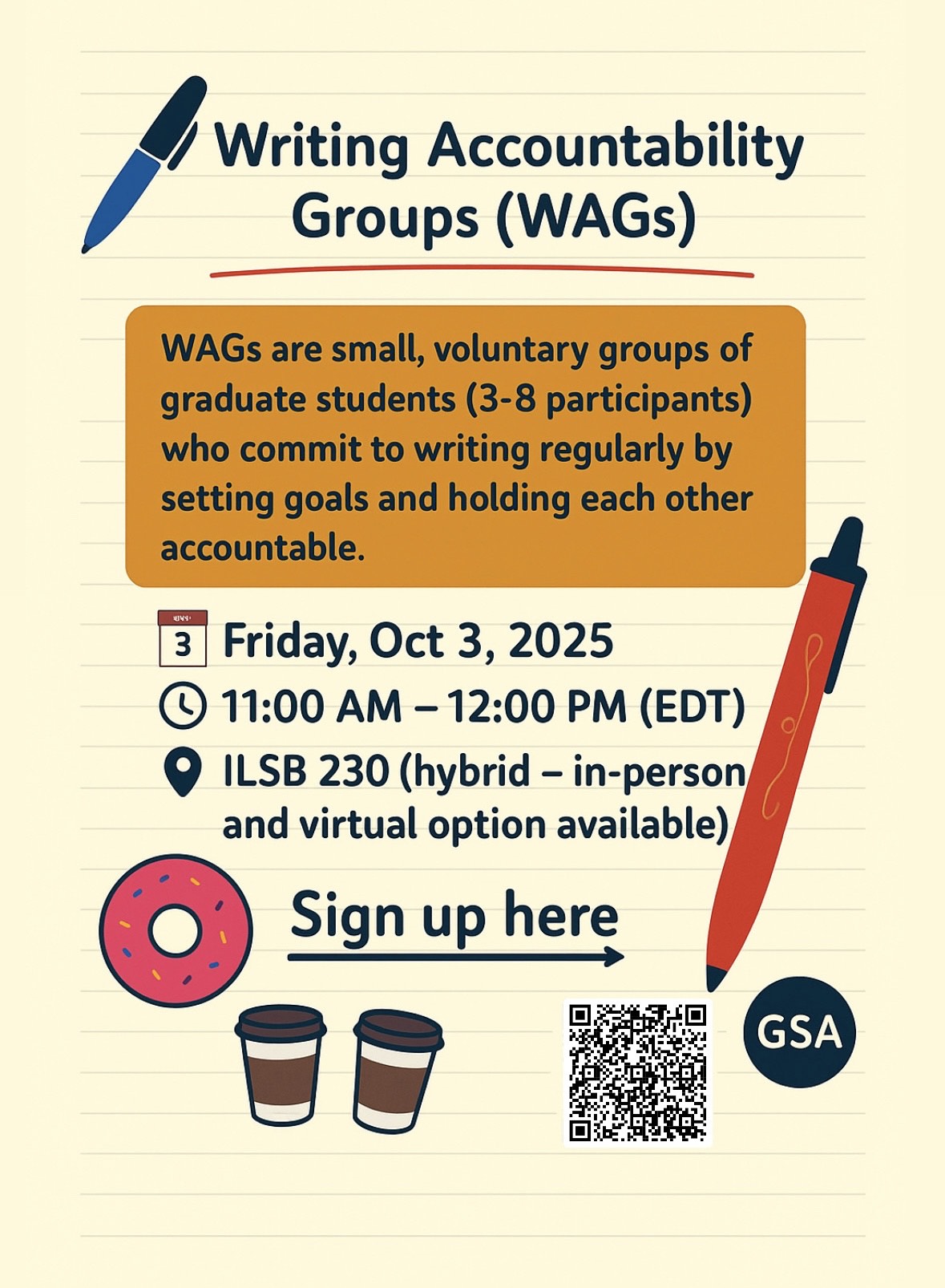 Who: WAGs are comprised of a group of graduate students (usually 4-8 participants per group) interested in developing writing habits and accountability