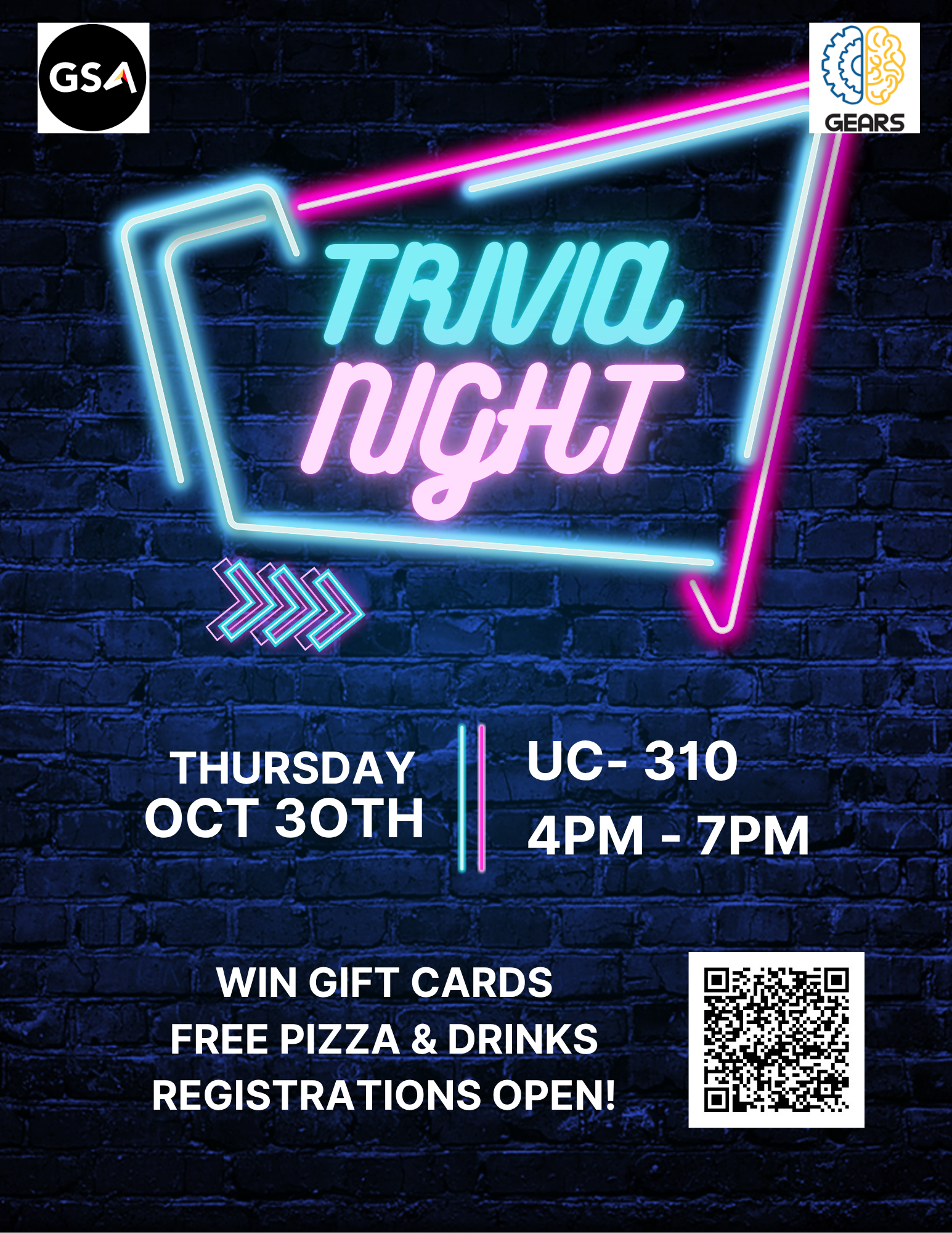 GEARS is hosting a Trivia Night, where you can challenge your knowledge, compete in teams, and win exciting gift cards (each member of the winning team will receive a $100 gift card)!