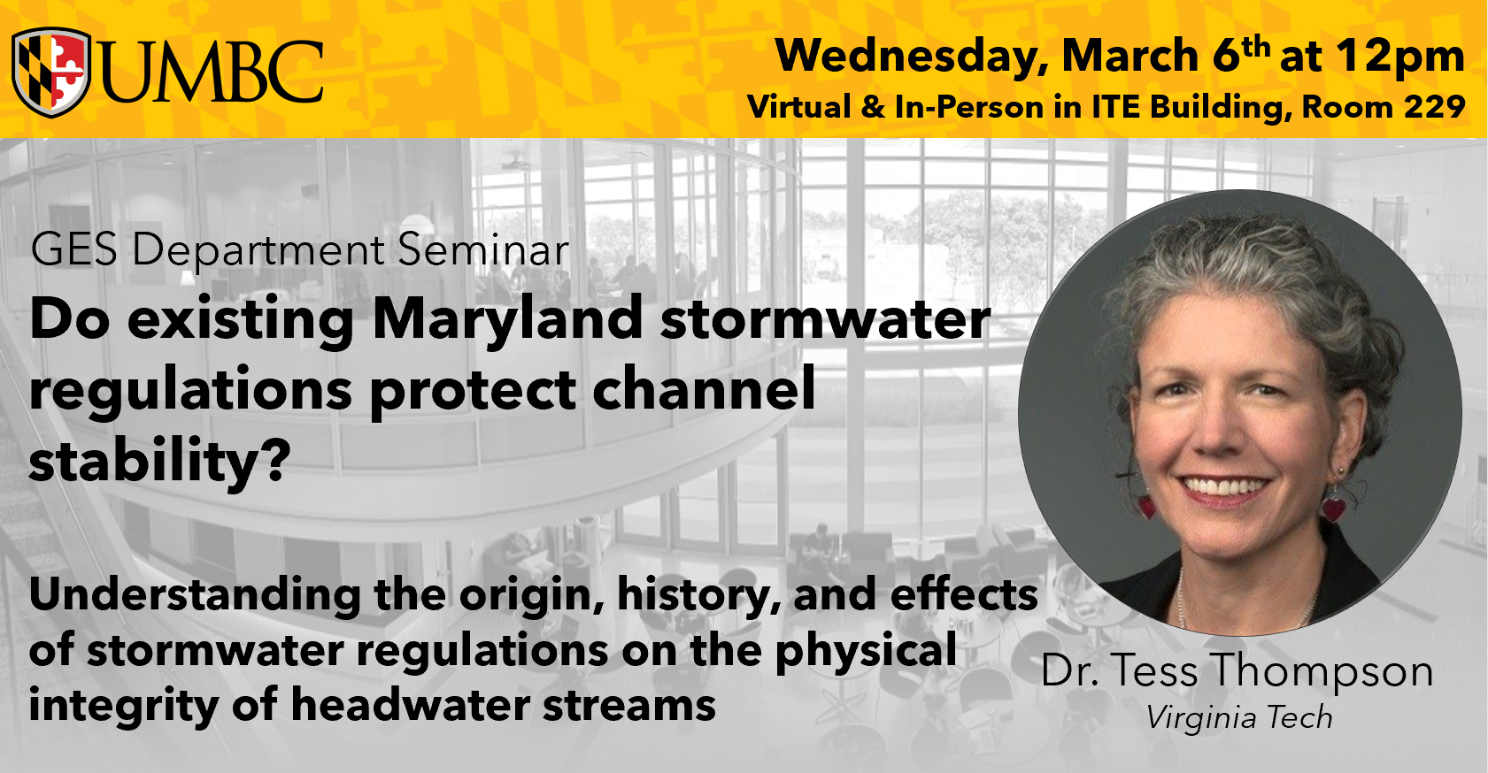 The GES department invites you all to this Wednesday’s seminar hosted by Dr. Tess Thompson. An associate professor at Virginia Tech, Dr. Thompson will be sharing her research on stormwater management solutions while offering a historic overview of Maryland’s stormwater regulations. The seminar will be held at noon on March 6th, 2024, in room 229 of the ITE building. Undergraduates, grad students, and GES faculty are all welcome to attend! Though this seminar will be available on Webex, we encourage students to attend in-person so that they may participate in Q&As and get an opportunity to mingle with other GES peeps.
