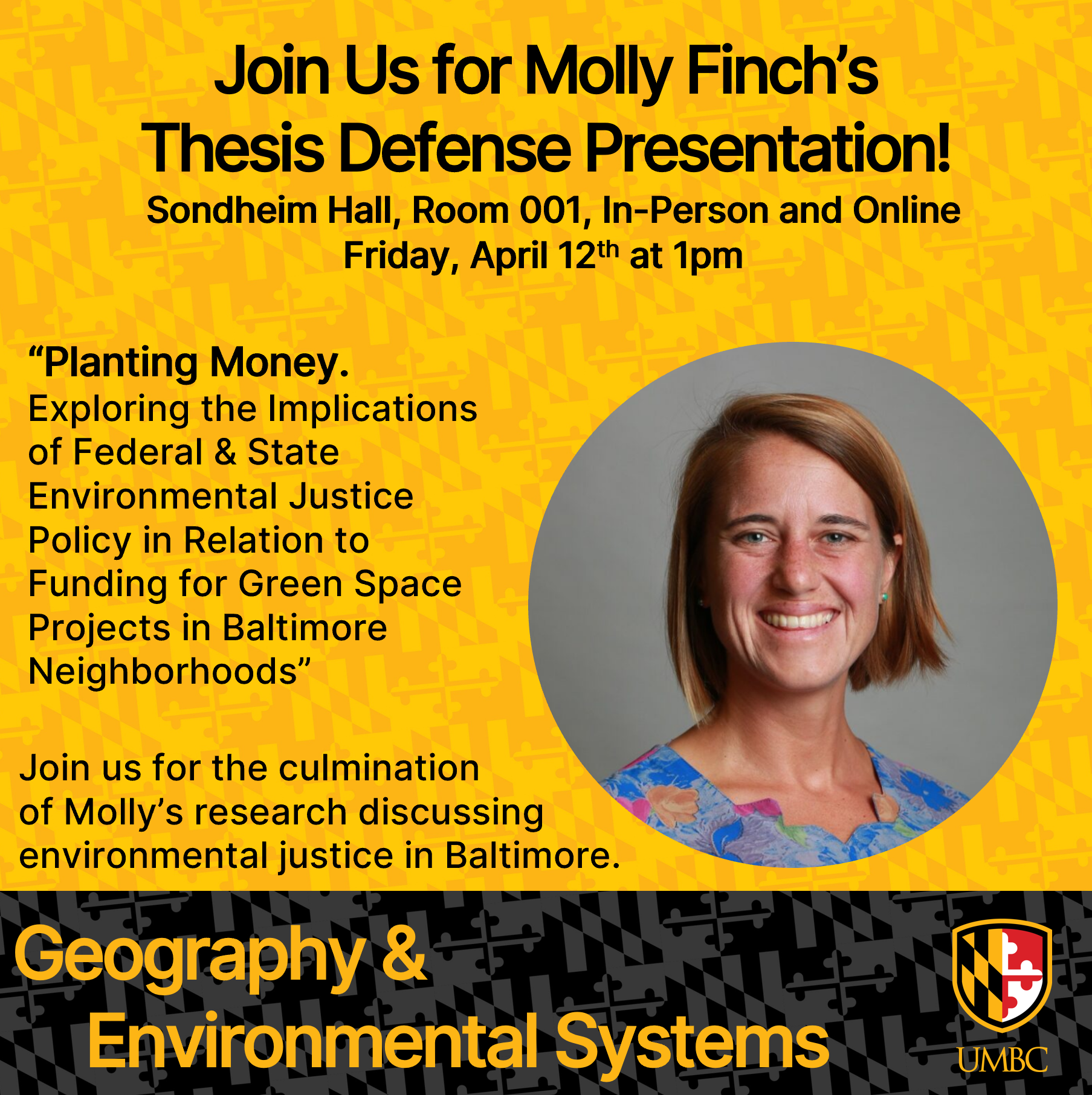 Molly’s thesis presentation will take place this Friday, April 12th at 1pm in Sondheim room 001. The event will be available in-person and online at the following link. We hope to see you there!: https://umbc.webex.com/umbc-en/j.php?MTID=m2e092f0b0e9677c0daa461db5e5ee725Thesis Defense: Planting Money, Green Projects in Baltimore