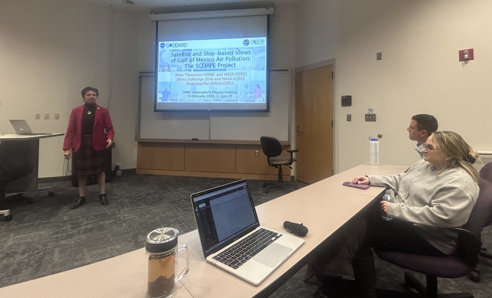 Second, Dr. Anne Thompson (614/UMBC), Senior Research Scientist, presented "Satellite and Ship-based Views of Gulf of Mexico Air Pollution: The SCOAPE Project" (authored by Dr. Thompson, Ryan Stauffer (NASA GSFC), and Debra Kollonige (NASA GSFC/SSAI); Dr. Kollonige is an alumna of UMBC (Ph.D. 2011).