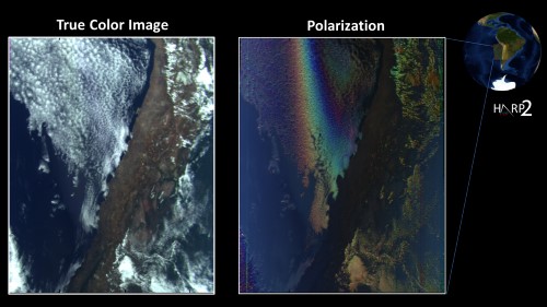 Photo: This is the PACE HARP2 “first-light” image showing cloudbows. The original caption reads: “Early images from PACE’s HARP2 polarimeter captured data on clouds over the west coast of South America on Mar. 11, 2024. The polarimetry data can be used to determine information about the cloud droplets that make up the cloudbow – a rainbow produced by sunlight reflected by cloud droplets instead of rain droplets. Scientists can learn how the clouds respond to man-made pollution and other aerosols and can measure the size of the cloud droplets with this polarimetry data. Credit: UMBC.”