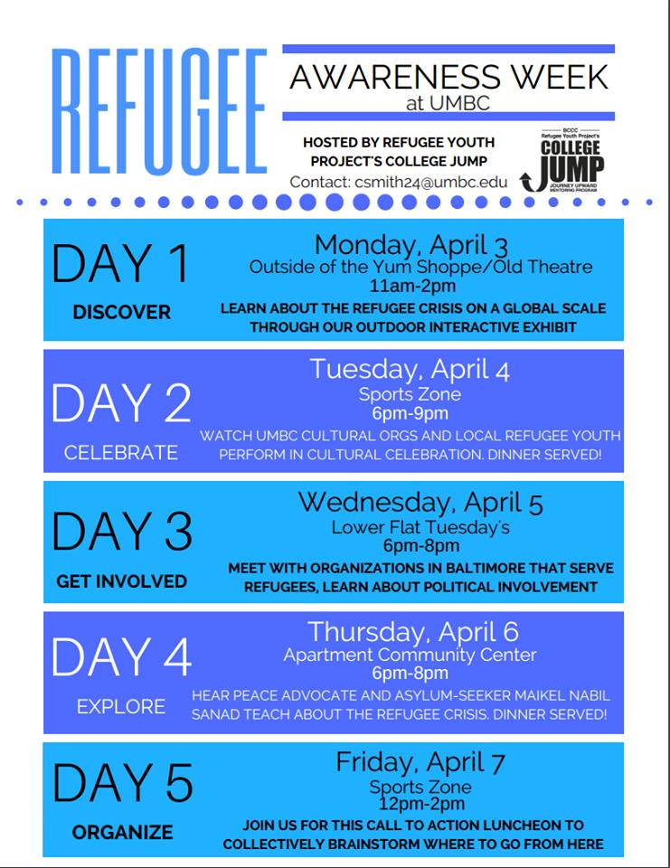 The Refugee Youth Project's College JUMP Program is hosting Refugee Awareness Week at UMBC! Join them for a week full of exciting events to learn more about the global refugee crisis and how you can get involved.