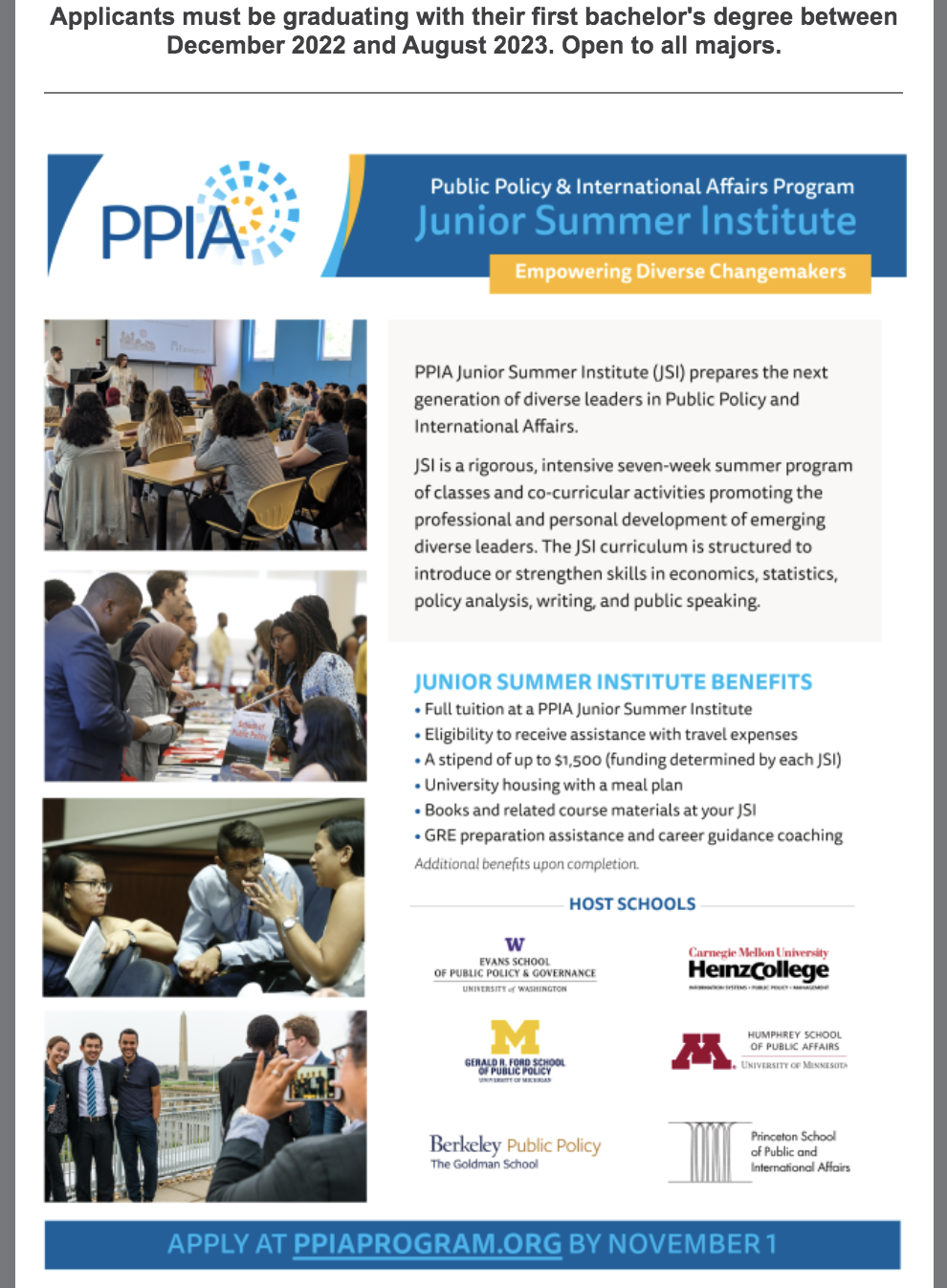 The PPIA Junior Summer Institute (JSI) Fellowship Program is a rigorous academic graduate level preparation program for undergraduate juniors committed to public service careers. The program was started to address the lack of diversity across the spectrum of professional public service, including government, nonprofits, public policy institutions, and international organizations. The purpose of the JSI Fellowship is to prepare students to obtain a Master’s or joint degree, in public policy, public administration, international affairs, or a related field.