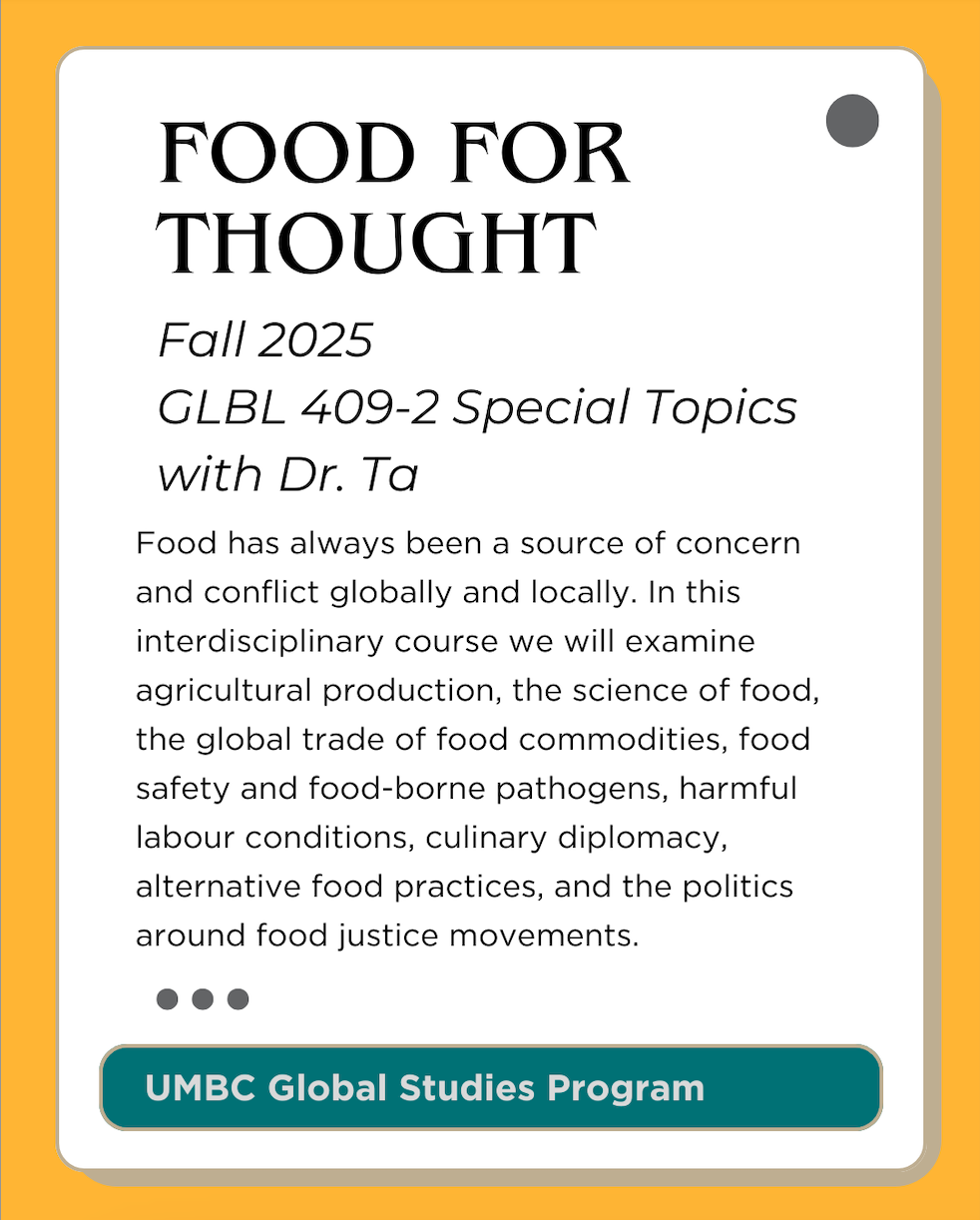 This summer GLBL will welcome Assistant Teaching Professor, Dr. Trang Ta to our faculty! Next semester she will be teaching two exciting new special topics courses. Food For Thought will be be offered Wednesday evenings, 4:30-7:05pm.