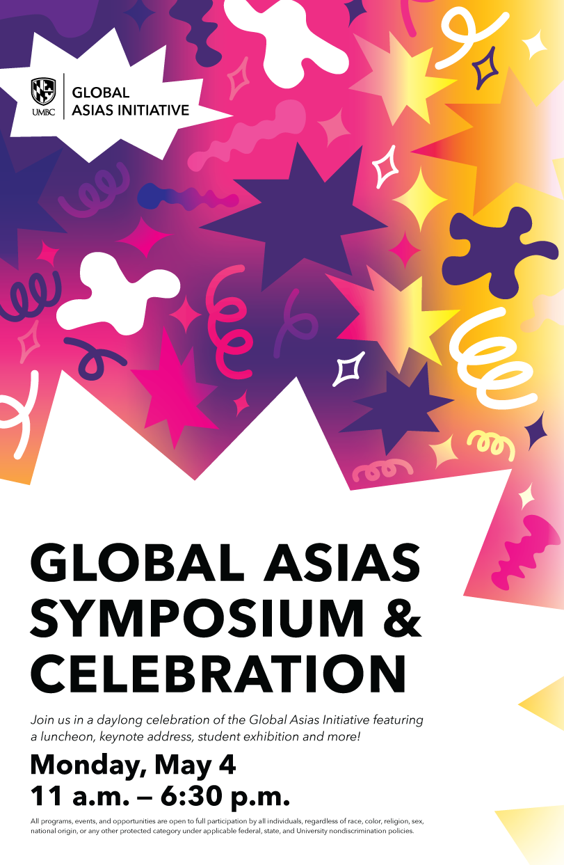 Join us on Monday, May 4 for a celebration of the many accomplishments of the Global Asias Initiative here at UMBC! The Global Asias Initiative, a three-year initiative funded by the Mellon Foundation, has created a forum for engaging in conversations in the fields of Asian American Studies, Asian diaspora studies, and Asian Studies and has strengthened support for Asian and Asian American students on campus. The Initiative has has created connections across disciplines, institutions, organizations, and communities here on campus and beyond.