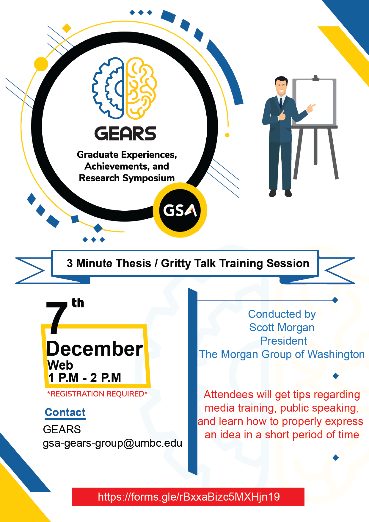 The Graduate Student Association in collaboration with Scott Morgan, President of The Morgan Group of Washington is hosting a virtual leadership workshop titled "3 Minute Thesis / The Gritty Talks Training Session" on Dec 7th, at 1 pm.