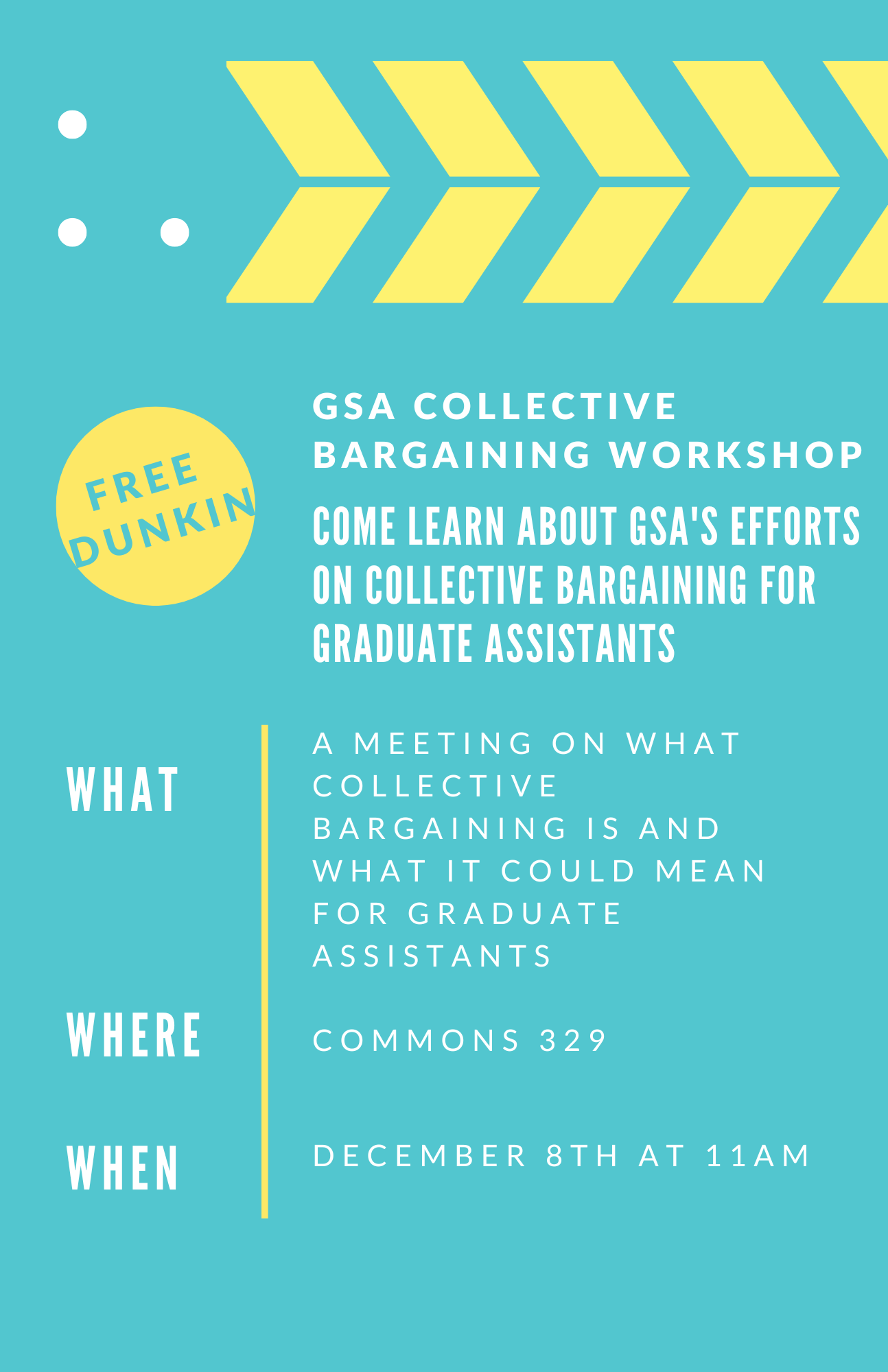Please join the GSA in Commons 329 to learn about the collective bargaining bill that would affect graduate assistants in the 2023 Maryland Legislative session. Enjoy some free Dunkin coffee and donutswhile we discuss what collective bargaining is, what this bill would do for graduate assistants and how the Maryland legislative process works. After the presentation, there will be a time for questions about GSA’s efforts and other USM schools' advocacy around this issue. We will also discuss steps moving forward!