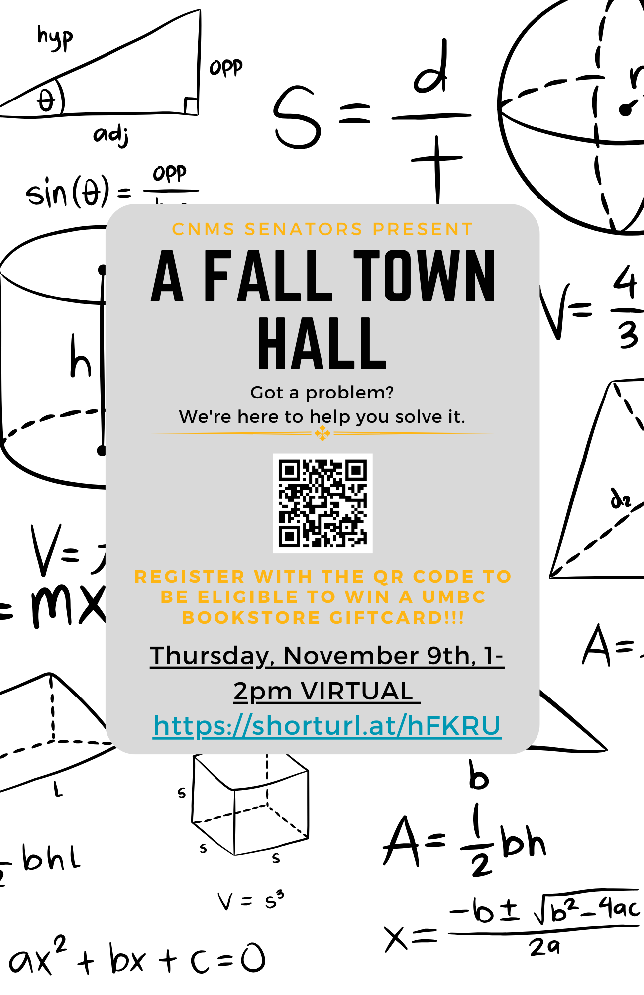 This upcoming town hall is for you! Come meet your representatives and see what is going on in GSA! Plus, scan the QR code to enter for a chance to win one of 3 $50 UMBC bookstore gift cards!