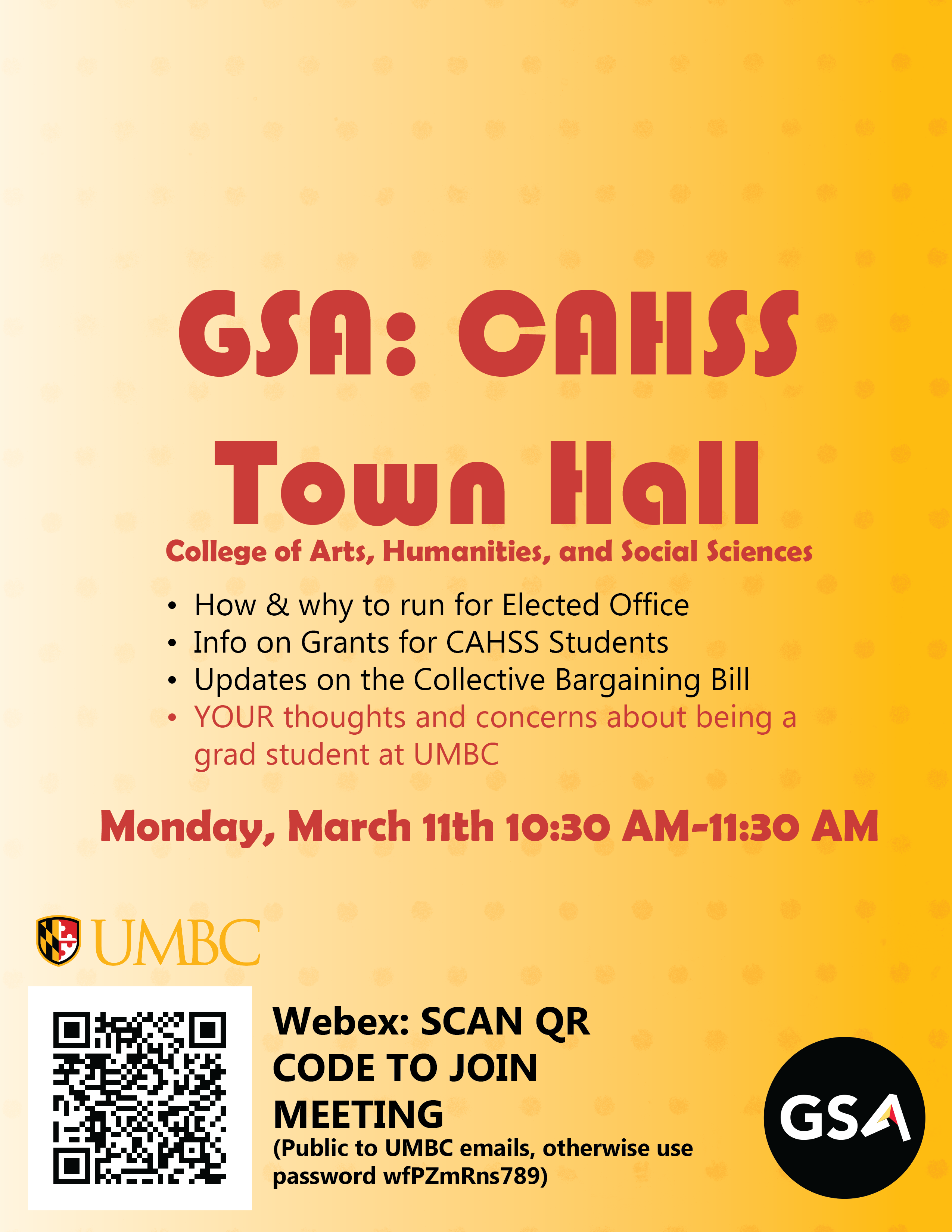 Dear CAHSS Grad students:We invite you to this semester's CAHSS Town Hall on Monday March 11th, 10:30-11:30 AM over webex, details on the flyer below. Ahead of the Town Hall, we would appreciate anyone who took five minutes to complete our survey (https://forms.gle/Wm2hWrARWLqRf6td8)-- if you are not able to make it to the Town Hall, this is still an important option to get your voice heard! We are hoping for at least one student from each CAHSS department to attend.Webex info:Meeting link:
