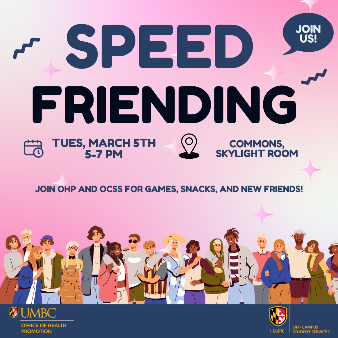 Another opportunity to make friends at UMBC! Join OCSS and OHP for Speed Friending on Tuesday, March 5, from 5 p.m. to 7 p.m. in The Commons, Skylight! Don't miss out on the connections, food, and giveaways!