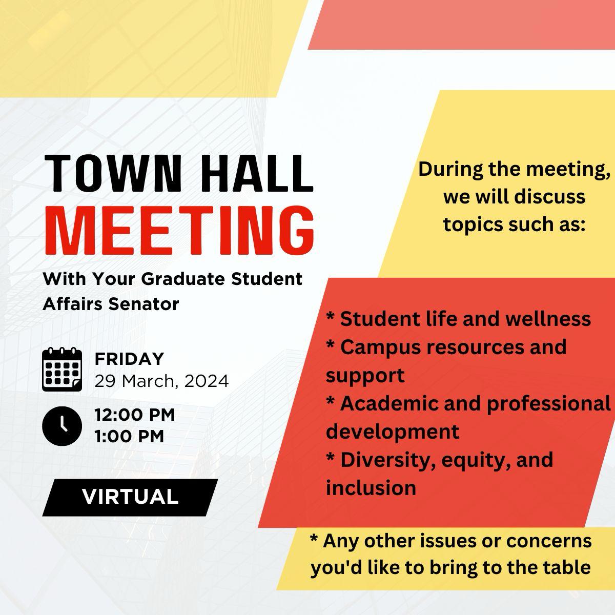 We're inviting you to join us for the upcoming Student Affairs Senate Town Hall, a unique opportunity for GSO's and graduate students to engage in meaningful discussions and connect with their GSA representatives.