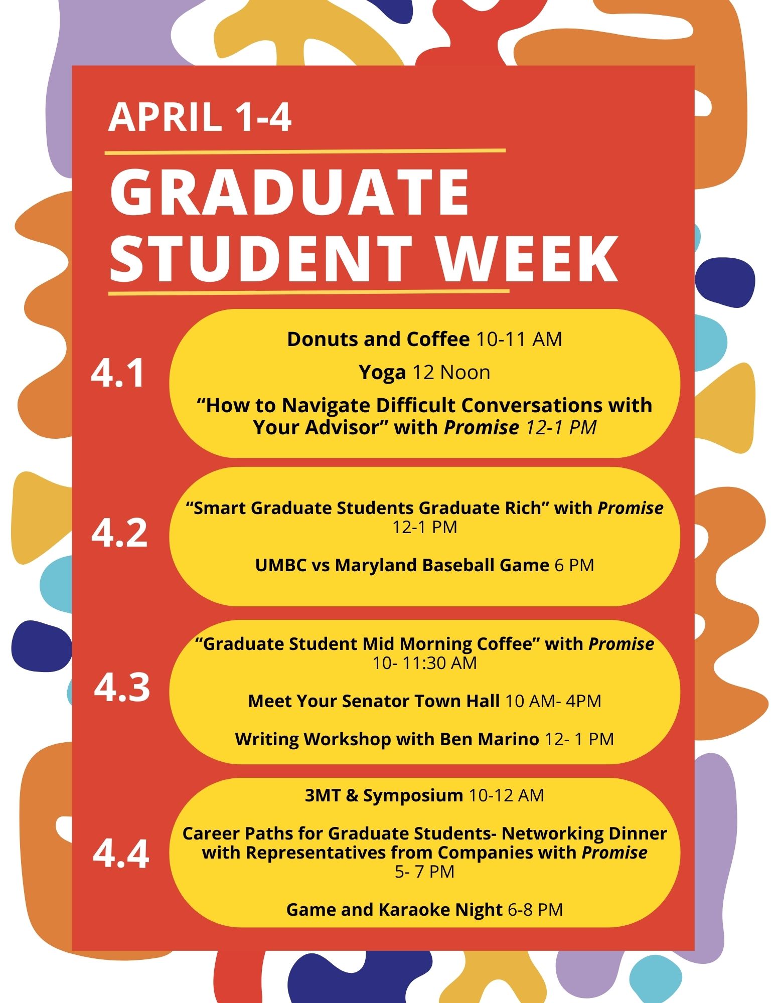 Mark your calendars and get ready for an unforgettable Graduate Student Week at UMBC! Let's make memories together!