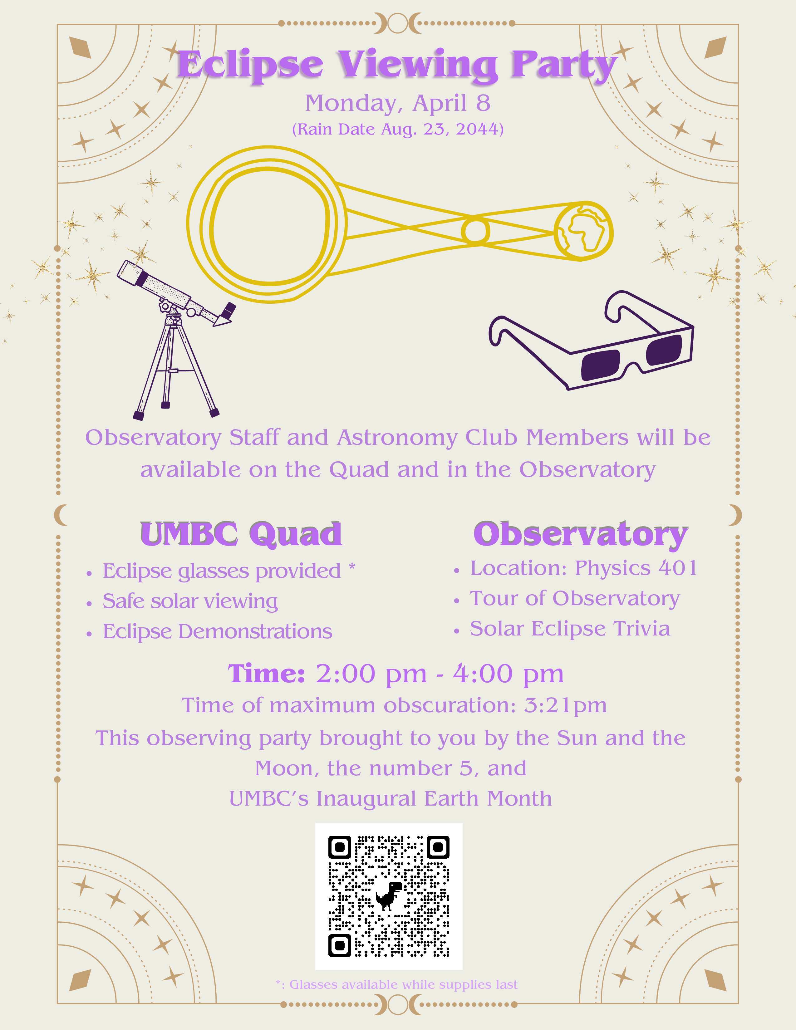 Experience the spectacle of a solar eclipse at UMBC Quad, today, April 8, from 2-4 PM. Join us for this rare event as the moon passes in front of the sun. Complimentary eclipse glasses provided for safe viewing. Don't miss this awe-inspiring phenomenon!
