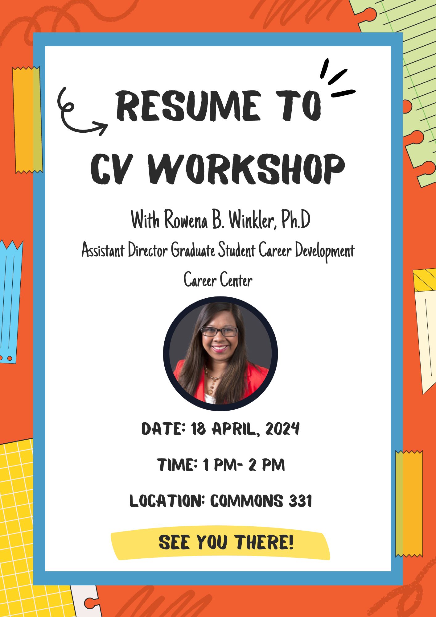Join us for a Resume to CV Workshop led by Dr. Rowena B. Winkler, Ph.D., Assistant Director of Graduate Student Career Development at the Career Center. From 1-2 PM, gain valuable insights on transforming your resume into a compelling curriculum vitae. See you there!