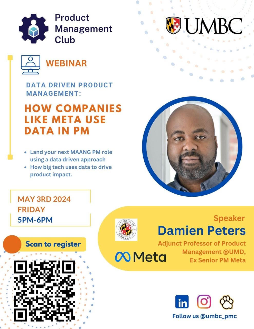 Save the date! Join us on May 3rd, 5-6 pm for a webinar featuring Damien Peters, Adjunct Professor of Product Management at the University of Maryland College Park and former Product Manager at Meta.