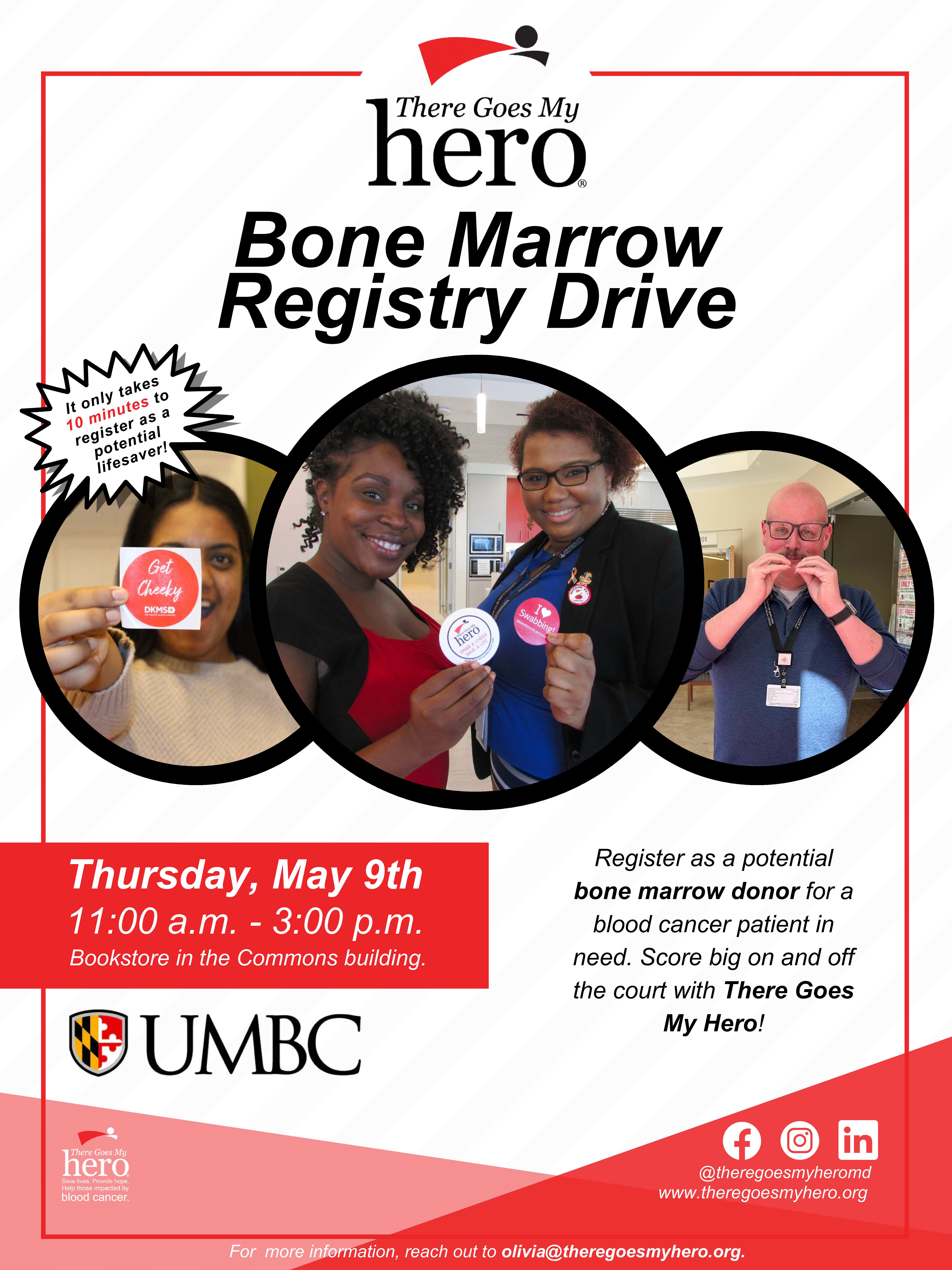 UMBC is partnering with local non-profit 'There Goes My Hero' for a swab drive benefitting the National Bone Marrow Registry!Currently, it's less likely for a person of color to receive a viable donor from the registry when they are diagnosed with blood-related cancers. This is due to limits in donations from adults of similar ancestry. There Goes My Hero seeks to bridge this gap with their ‘Color the Registry’ initiative, which aspires to educate potential donors and recruit more life-savers to the registry.Registering takes only 10 minutes and includes just swabbing your cheek!