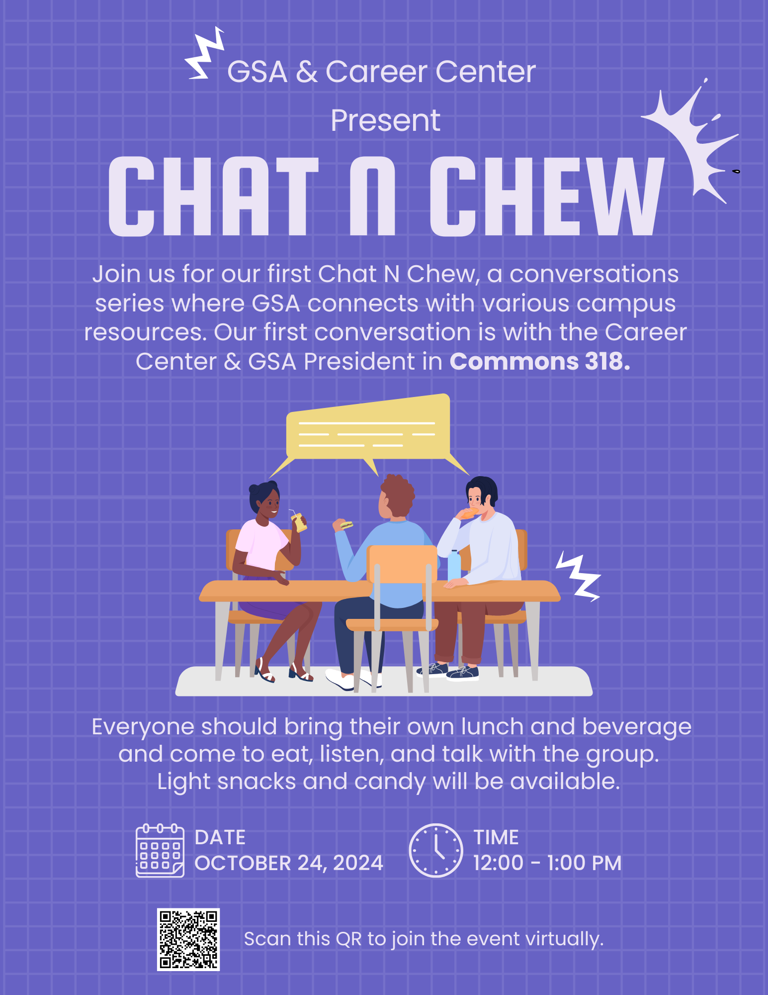 Our first Chat N Chew is coming up this Thursday! Join us in Commons 318 from 12-1pm, or tune in virtually! More details in the flier below. Please RSVP on our MyUMBC event using this link.