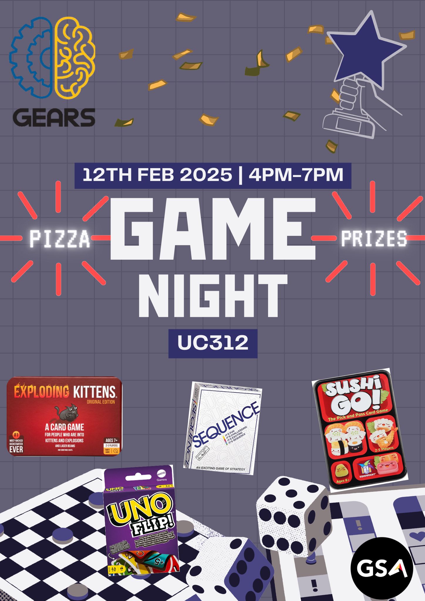 Join us in UC312 from 4 PM to 7 PM for an evening of board game fun! We'll have a variety of games, Sequence, Exploding Kittens, Sushi Go and More!, to choose from, along with free pizza and exciting prizes for the winners.