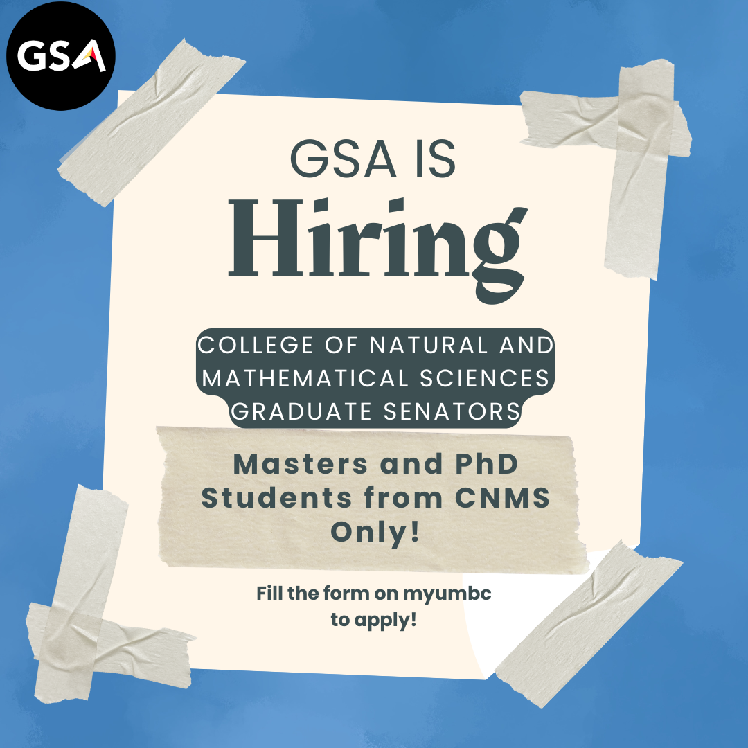 The Graduate Student Association (GSA) is now accepting nominations for four College of Natural and Mathematical Sciences (CNMS) Graduate Senator positions — an opportunity to represent over 2,500 graduate students and shape the future of student life at UMBC.
