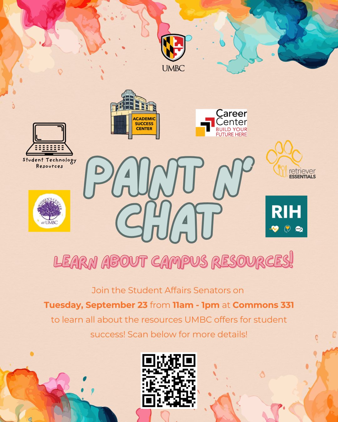 Join the Student Affairs Senators on Tuesday, September 23 from 11am – 1pm in Commons 331 for Paint N’ Chat. This is a chance to explore the many resources UMBC offers while enjoying a fun, creative break!