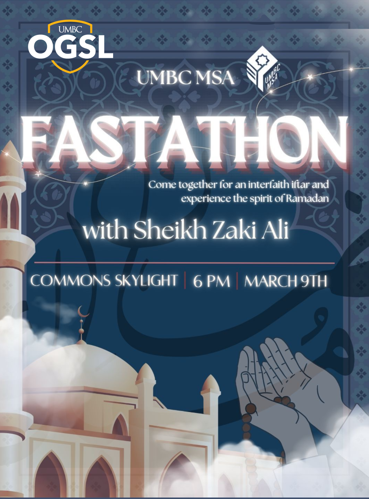 The Muslim Student Association (MSA), in collaboration with the Office of Graduate Student Life (OGSL), invites the UMBC community to Fastathon, an interfaith iftar to come together and experience the spirit of Ramadan.
