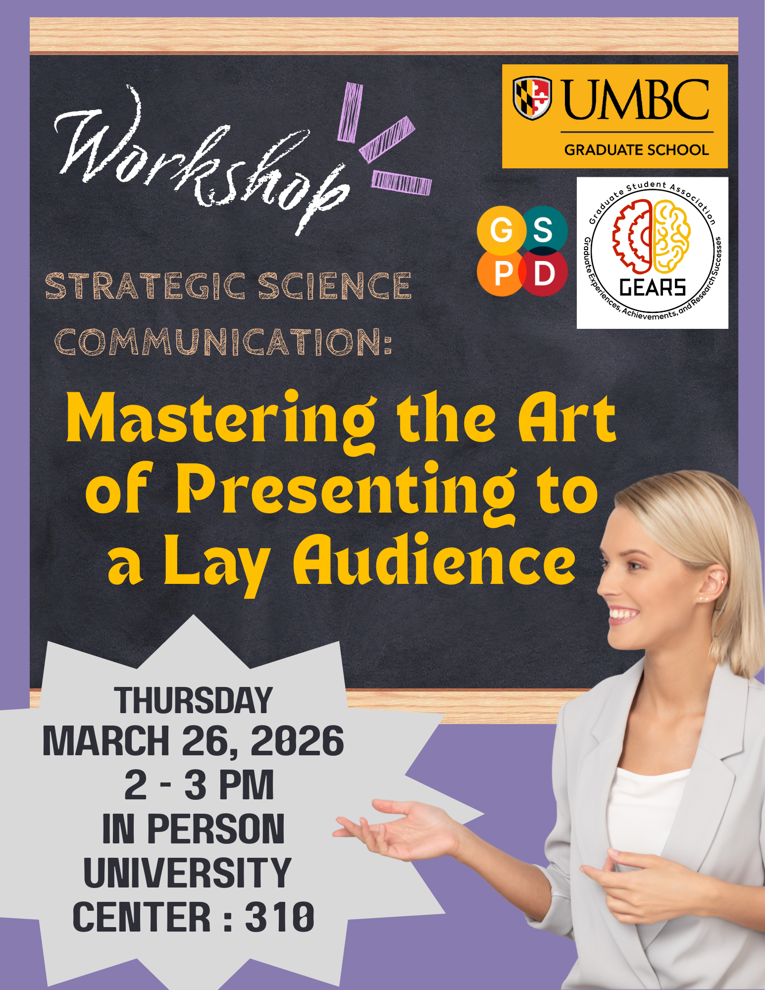 This event is a collaboration between the Graduate Student & Postdoctoral Development (GSPD) team and the Graduate Experiences, Achievements, and Research Successes (GEARS) committee of the Graduate Student Association (GSA).