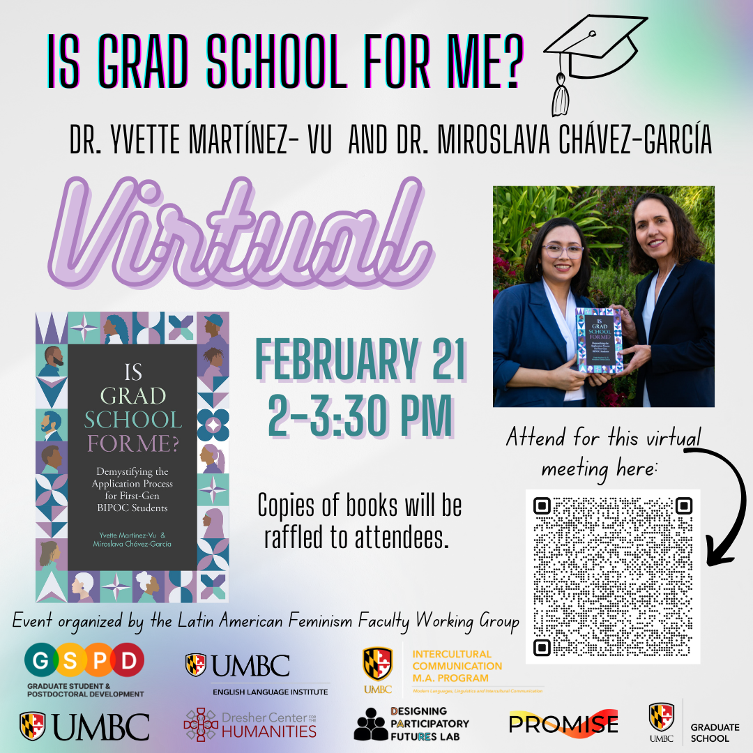 Join Dr. Yvette Martínez-Vu and Dr. Miroslava Chávez-García for an honest conversation about the graduate school process. They will discuss their book, Is Grad School for Me?, a useful guide designed to help first-gen, low-income, students of color, and non-traditional students through the process of graduate school, from deciding to attend, selecting programs, applying, and thriving in higher education.