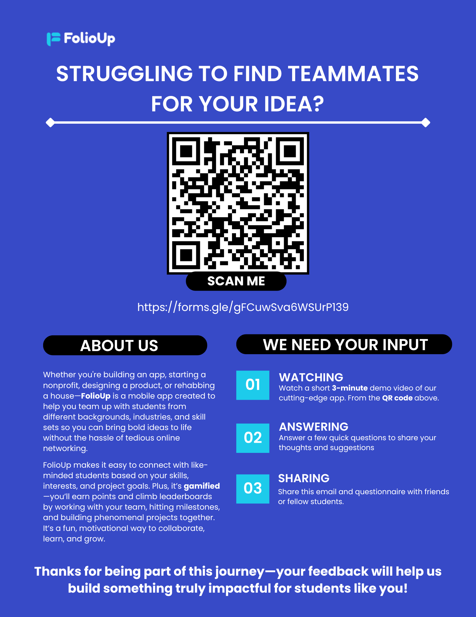 FolioUp is a new mobile app designed to help student innovators like you connect with teammates across different backgrounds, industries, and skill sets. Whether you're building an app, launching a nonprofit, designing a product, or starting something totally new—FolioUp makes it easy to find the right partners for your bold ideas.